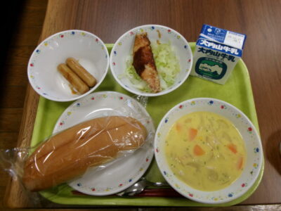 コッペパン(横切り)、牛乳、キャベツ、コーン豆乳スープと