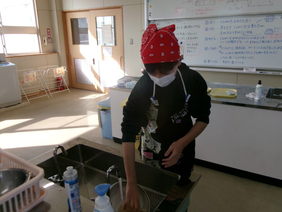 今日は、6年1組が家庭科調理実習が行いました。2組と同様、ジャーマンポテトを作りました。じゃがいもは皮をむき、包丁で切り、ゆでてから、たまねぎ、ベーコンと一緒に炒めて味付けしました。