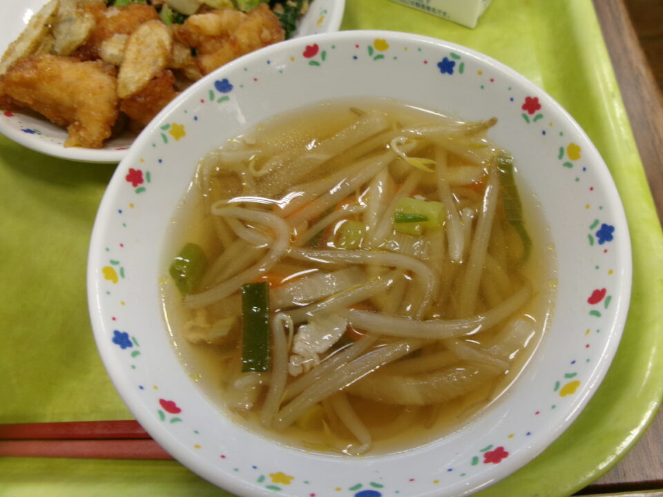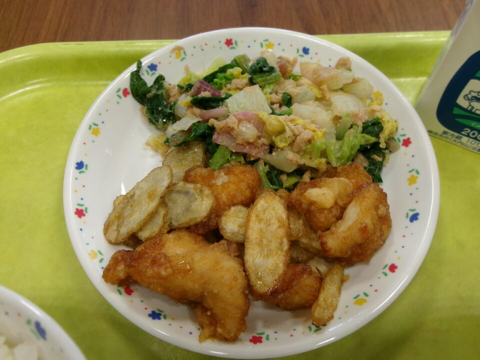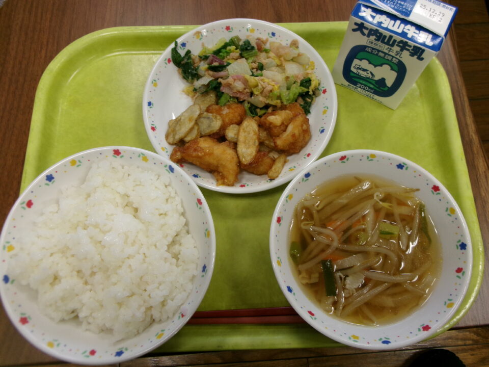ご飯、牛乳、チキンチキンごぼう、松阪赤菜のツナ和え、沢煮椀でした。