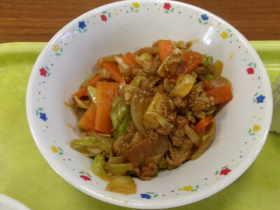今日のメニューは、ご飯(麦入り)、牛乳、ホイコーロー、大根わかめサラダでした。