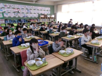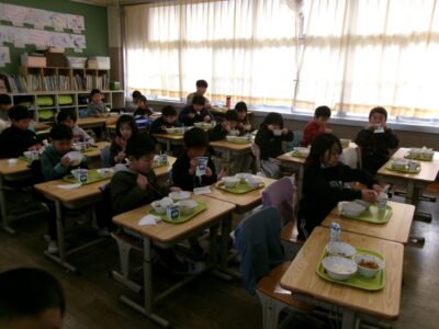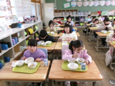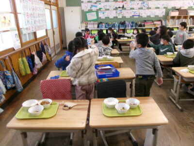 子どもたちは、手洗い、消毒、マスクをして給食当番さんが盛り付けをして、セルフサービスで給食をもらいに並びました。