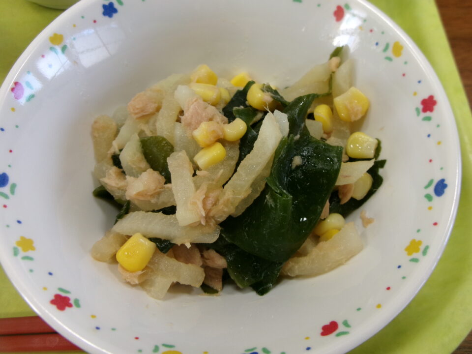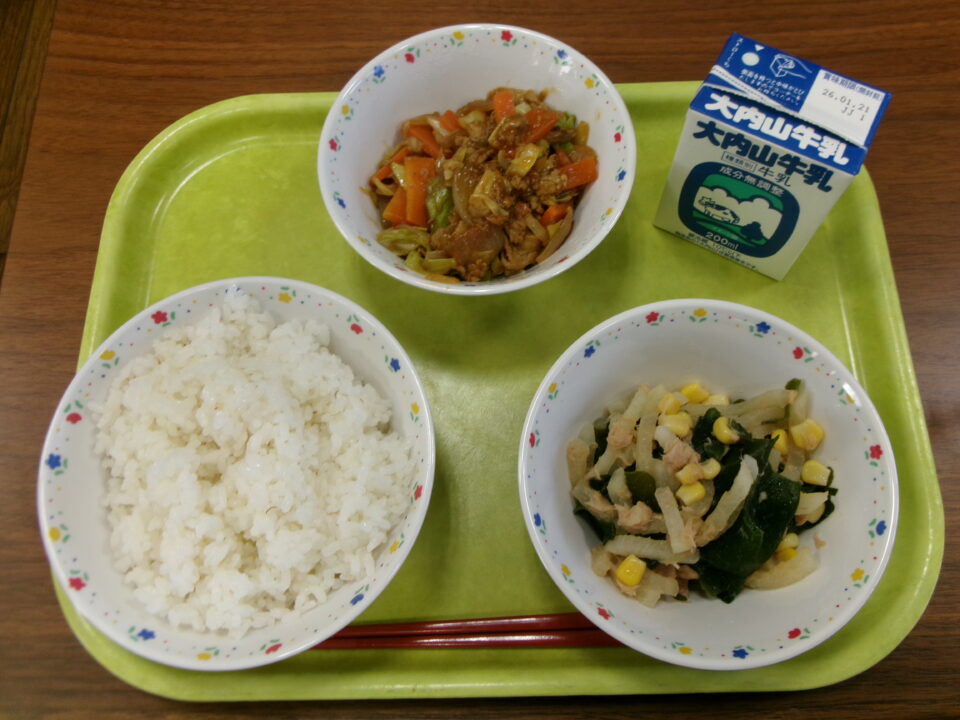 今日のメニューは、ご飯(麦入り)、牛乳、ホイコーロー、大根わかめサラダでした。