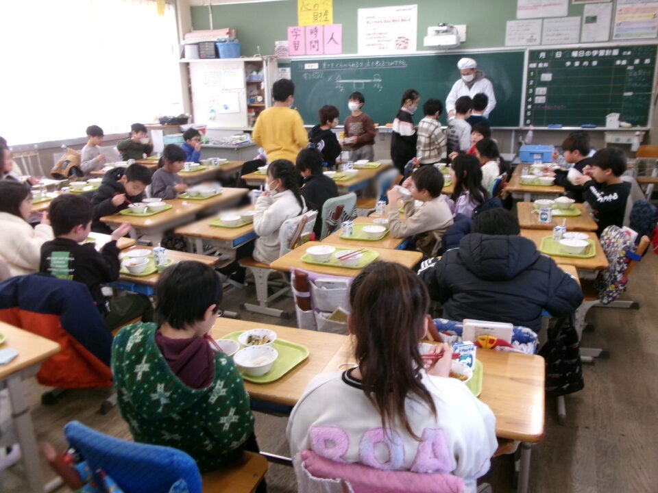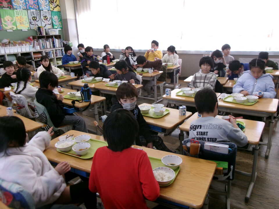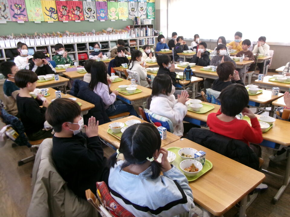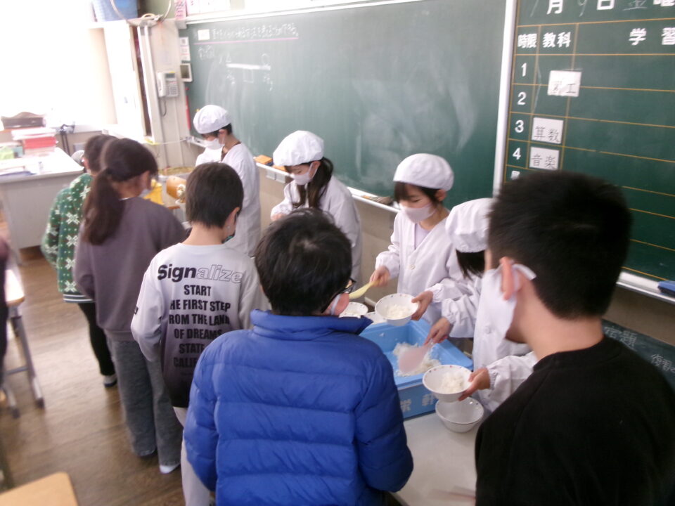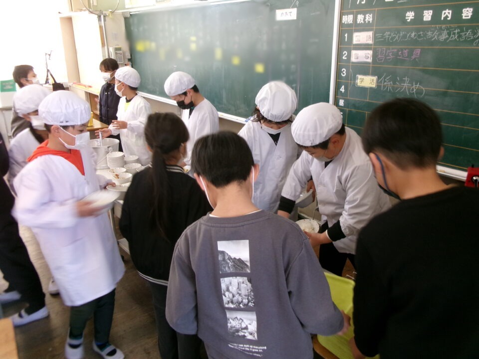 子どもたちは、手洗い、消毒、マスクをして給食当番さんが盛り付けをして、セルフサービスで給食をもらいに並びました。