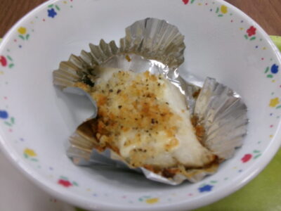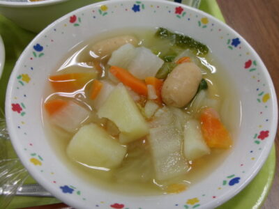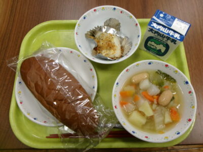 今日の給食は、黒糖パン、牛乳、さわらの香草米パン粉焼き、冬野菜のポトフでした。