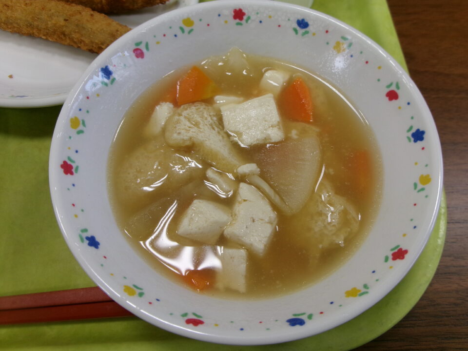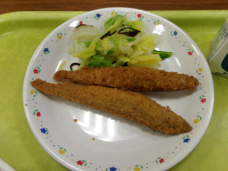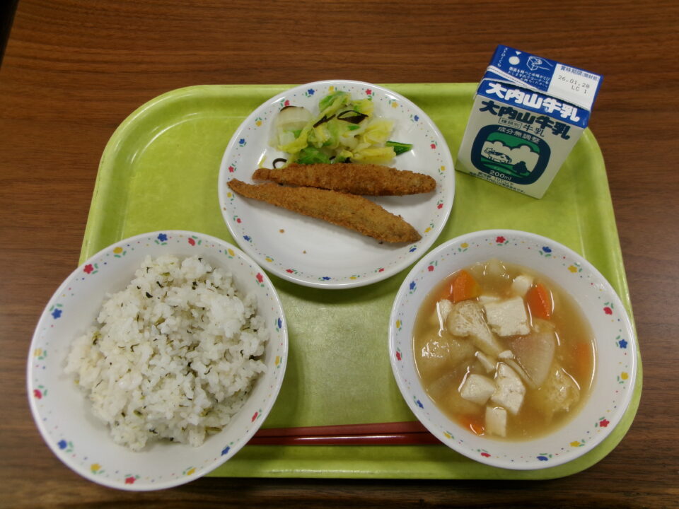 今日きょう給食きゅうしょくは、菜飯なめし麦入むぎいり)、牛乳ぎゅうにゅう、ししゃもフライ、白菜はくさい塩昆布和しおこんぶあえ、けんちんじるでした。