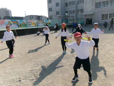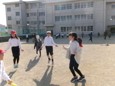 私にも縄跳びをしてみるようにと縄を貸してくれたので、挑戦してみたら、跳べたのは跳べましたが、身体が重く、子どもたちのように軽快にはならず、息切れがしました。子どもたちの軽やかな跳びはすばらしい!!