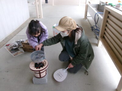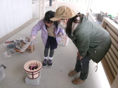牧野さんに見本を見せていただき、おうえん隊の方も教えていただいたようにしたら、すぐに火がついて、あられを炒ってみました。