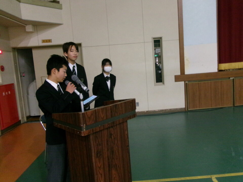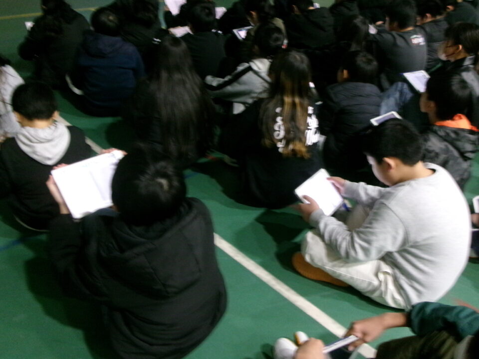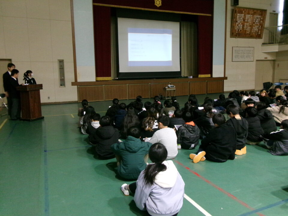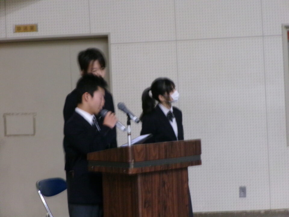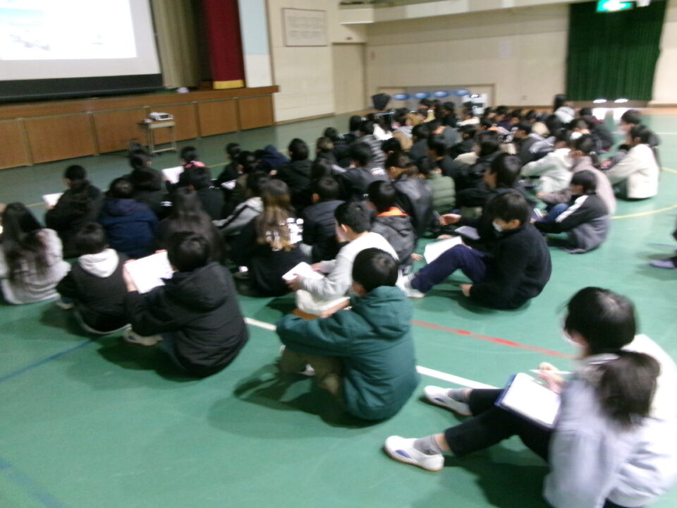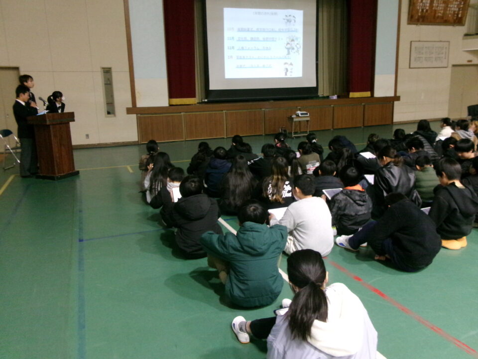 年生ねんせいのみなさんは、小学校生活しょうがっこうせいかつは、1がつのこすところあと1週間しゅうかん。そして、2がつ、3がつはあっというかもしれません。今日きょうは、鎌田中学校かまだちゅうがっこうから先生せんせい第四小学校だいよんしょうがっこう卒業そつぎょうした生徒せいとさんがてくれて、鎌田中学校かまだちゅうがっこう入学にゅうがくするにあたって、おはなしかせてもらいました。