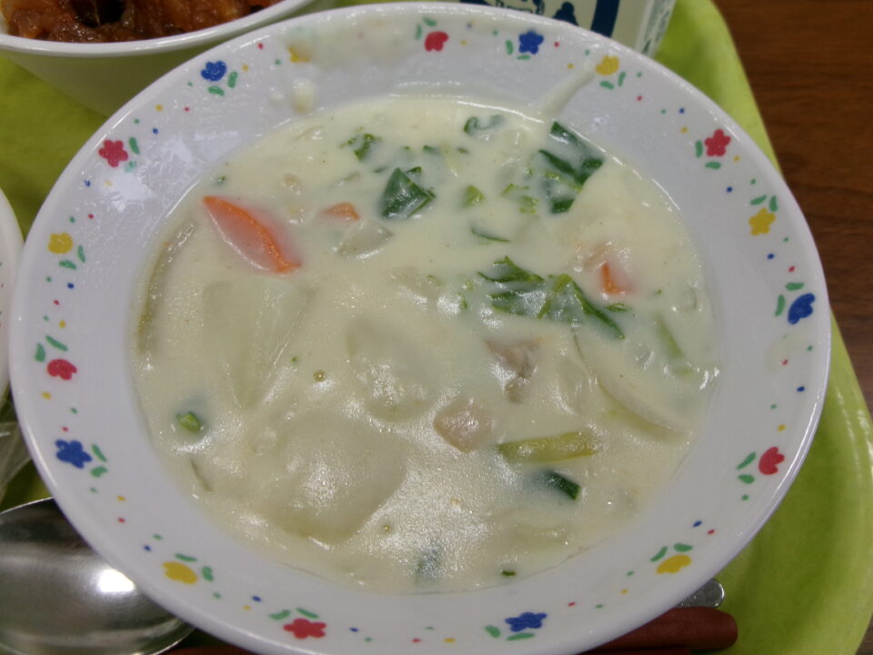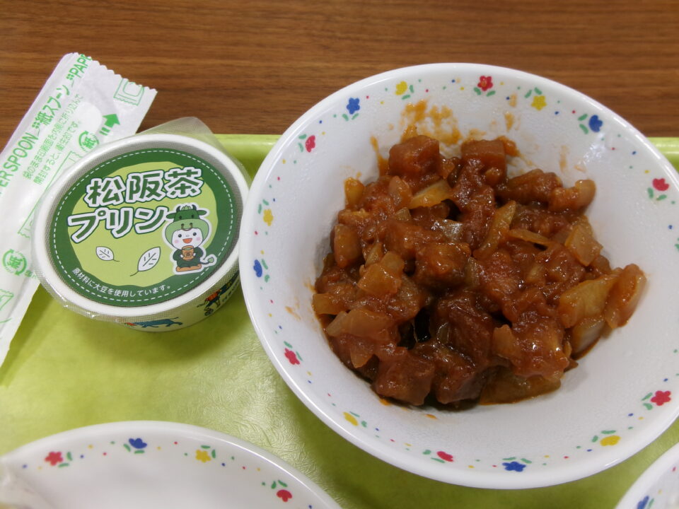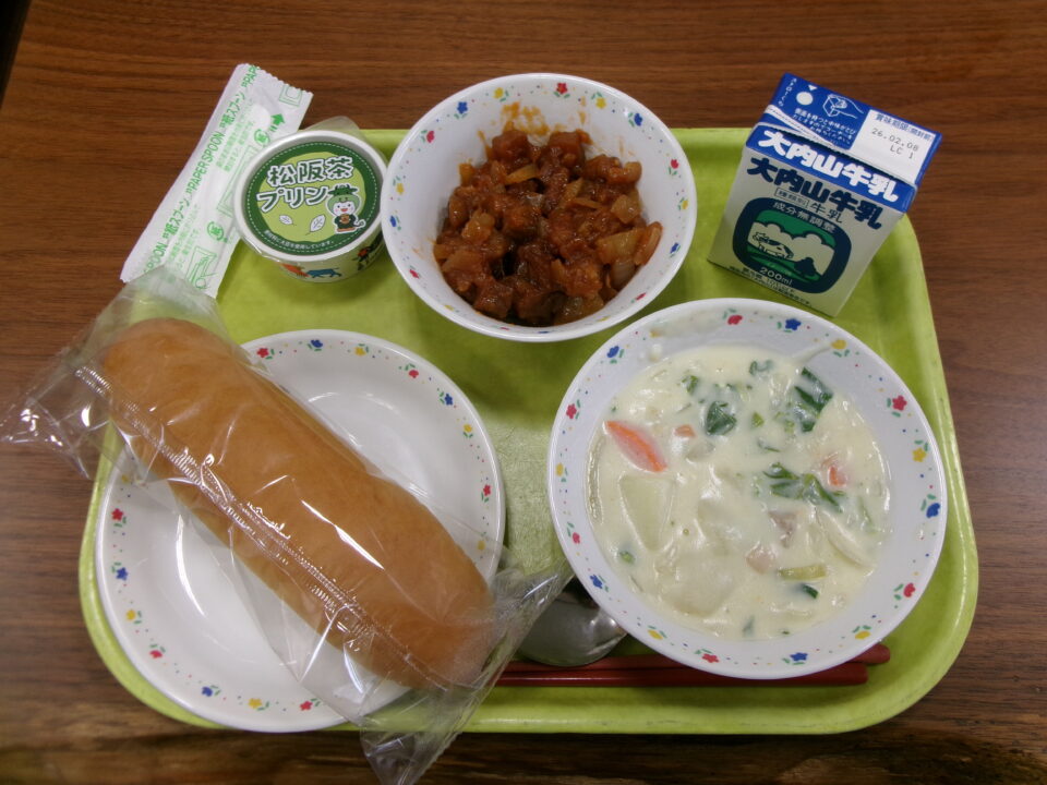 今日の給食は、コッペパン、牛乳、まぐろのオニオンソース、なばな入り米粉ポタージュ、松阪茶豆乳プリンでした。