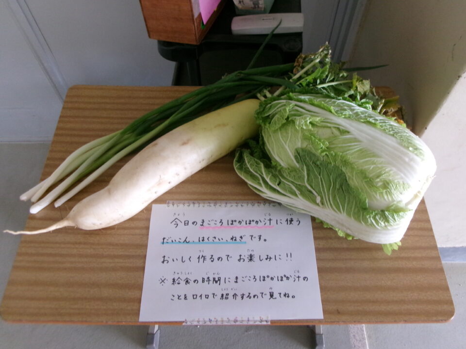今日きょうの「まごころぽかぽかじる」は、地産地消ちさんちしょう取組とりくみとして、地域ちいきかたどもたちのご家族かぞくかたつくられている食材しょくざい提供ていきょうしていただきつくりました。