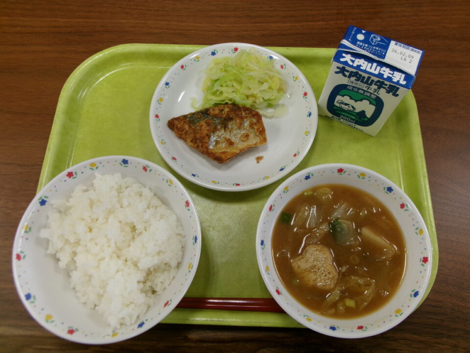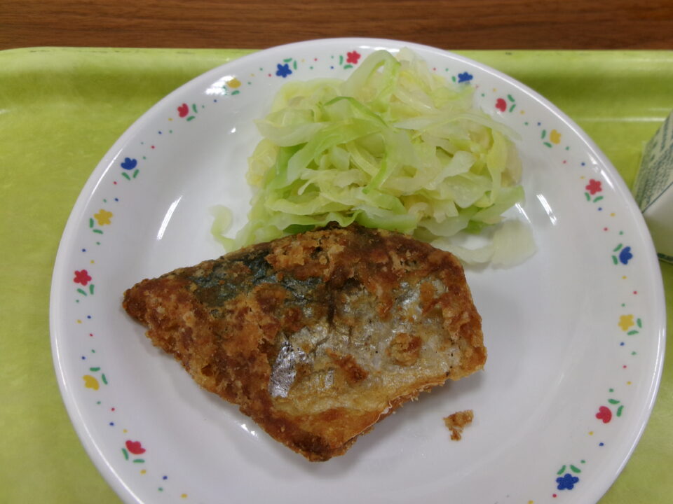 今日きょう給食きゅうしょくは、ごはん牛乳ぎゅうにゅう、さばの竜田揚たつたあげ、キャベツとたくあんのもの、まごころぽかぽかじるでした。