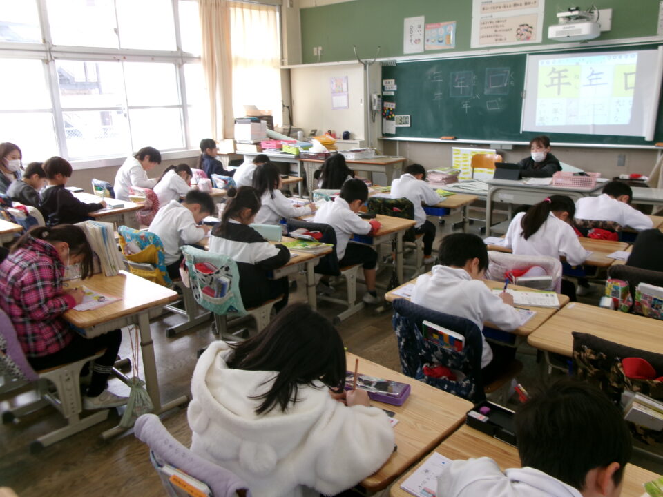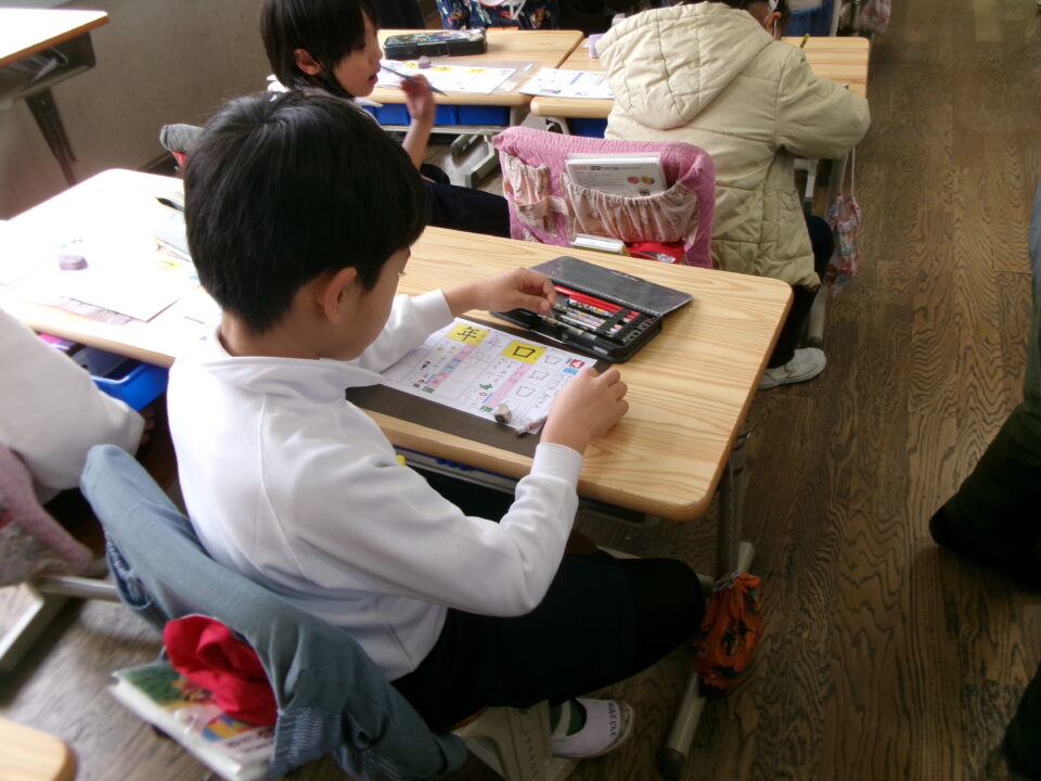 1組は、漢字の練習でした、「口」「年」を覚えました。前に映し出されたアプリを使って、指書き、なぞりなどをしてから、練習して覚えています。