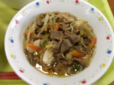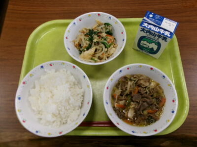 メニューは、ご飯、牛乳、松阪牛のすき煮、ほうれん草と油揚げの和え物でした。