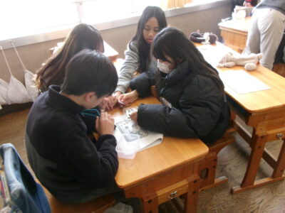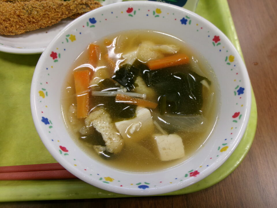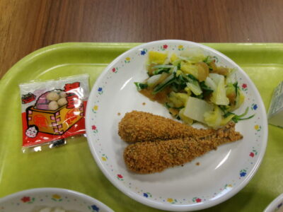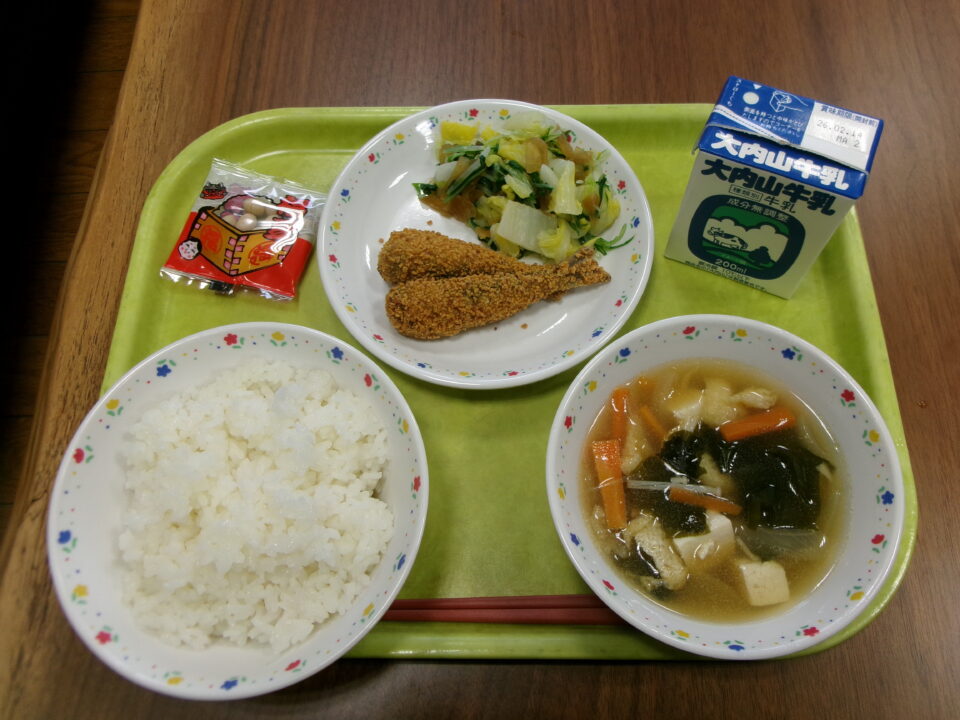 メニューは、ご飯、牛乳、いわしのかりかりフライ、水菜と白菜の福神和え、すまし汁、節分豆でした。