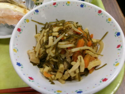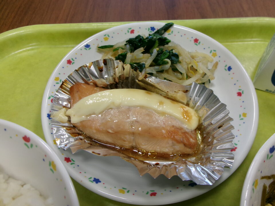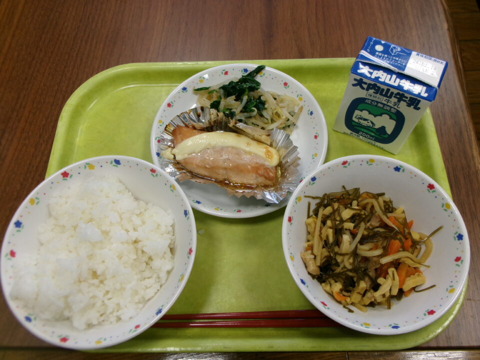 今日きょう給食きゅうしょくは、ごはん牛乳ぎゅうにゅう、さけのマヨネーズき、ほうれん草入そういりごまえ、昆布こんぶ高野豆腐こうやどうふふくでした。