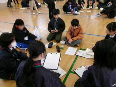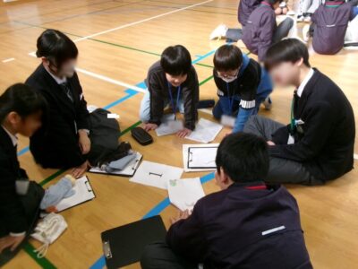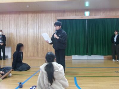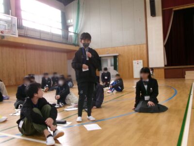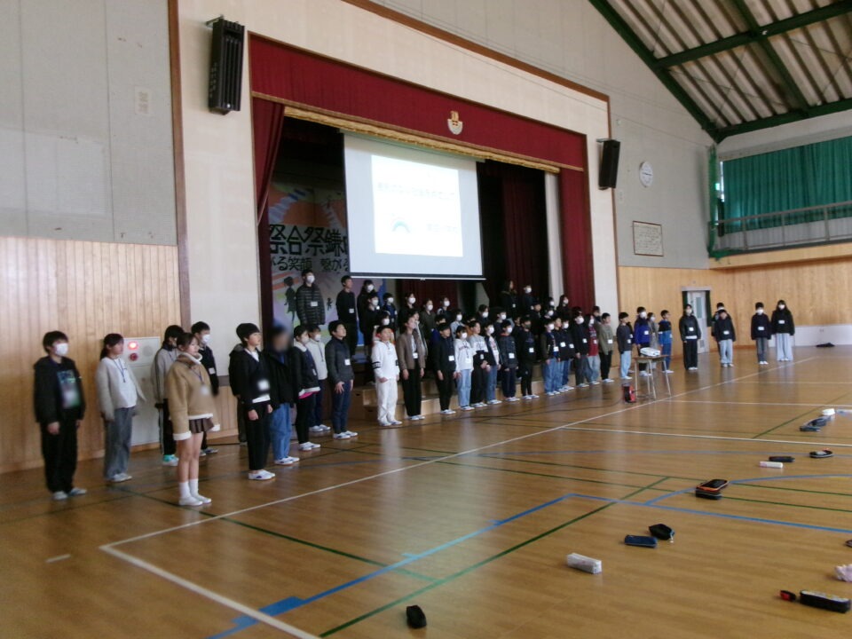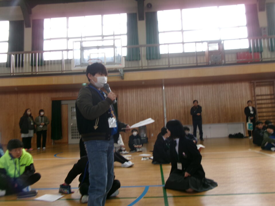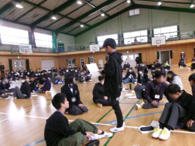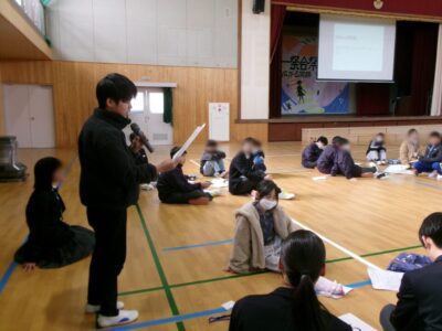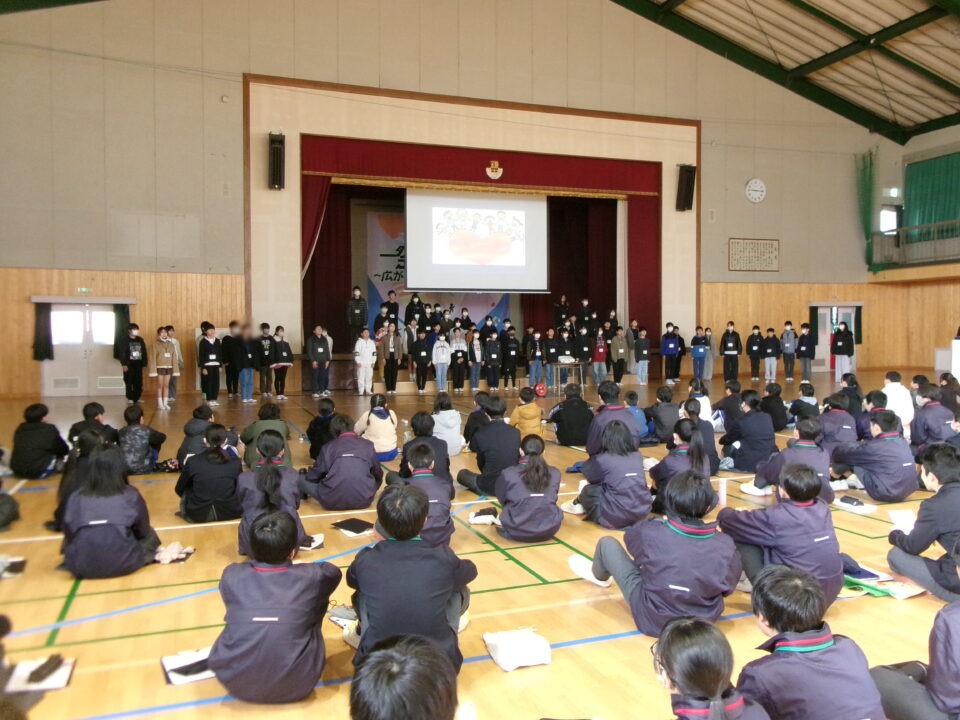 今日は、鎌田中学校2年生、港小学校6年生のみなさんと第四小学校6年生の子たちが鎌田中学校体育館に集まり、人権フォーラムを開催しました。