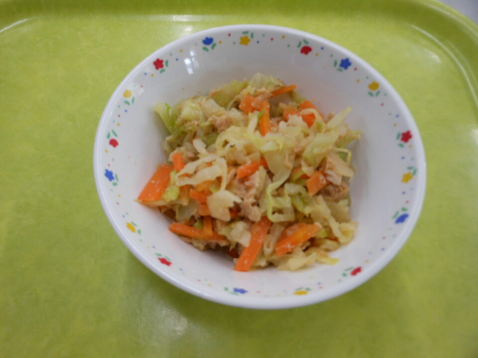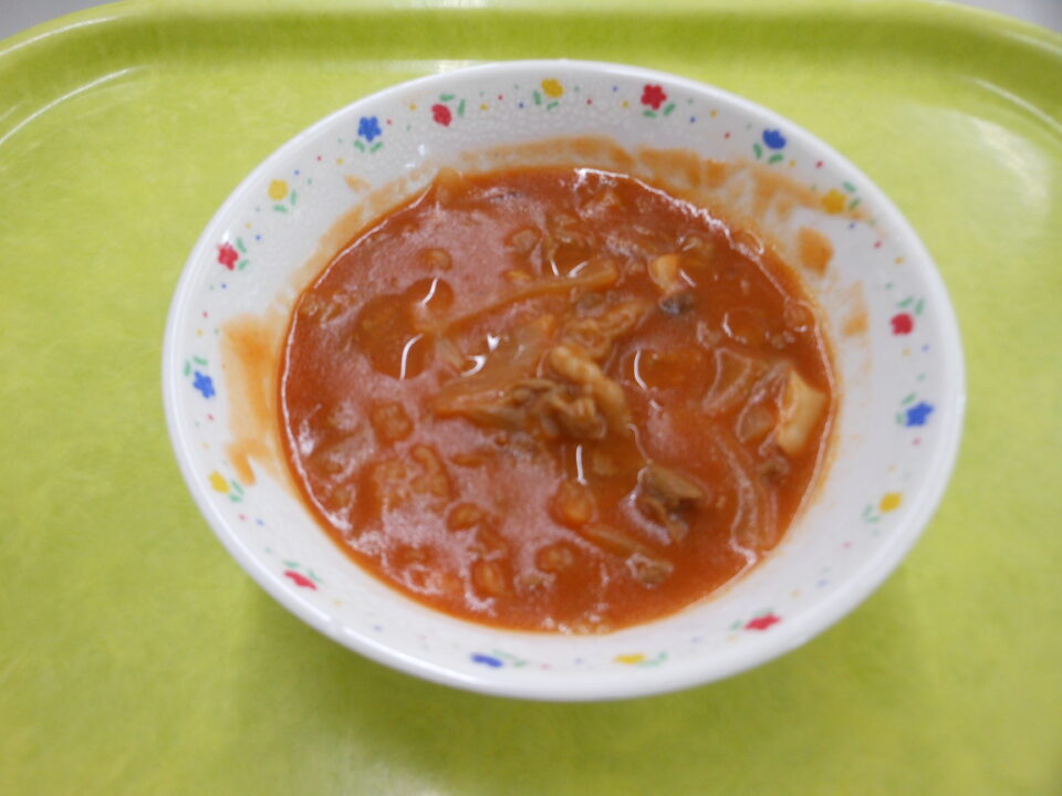 今日の給食は、ご飯(麦入り)、牛乳、米粉のハッシュドビーフ、なばなの和え物でした。