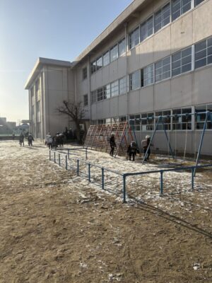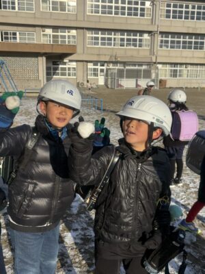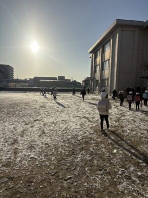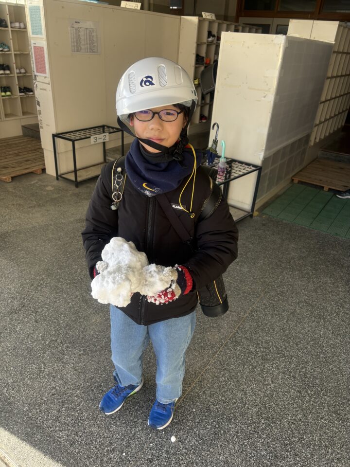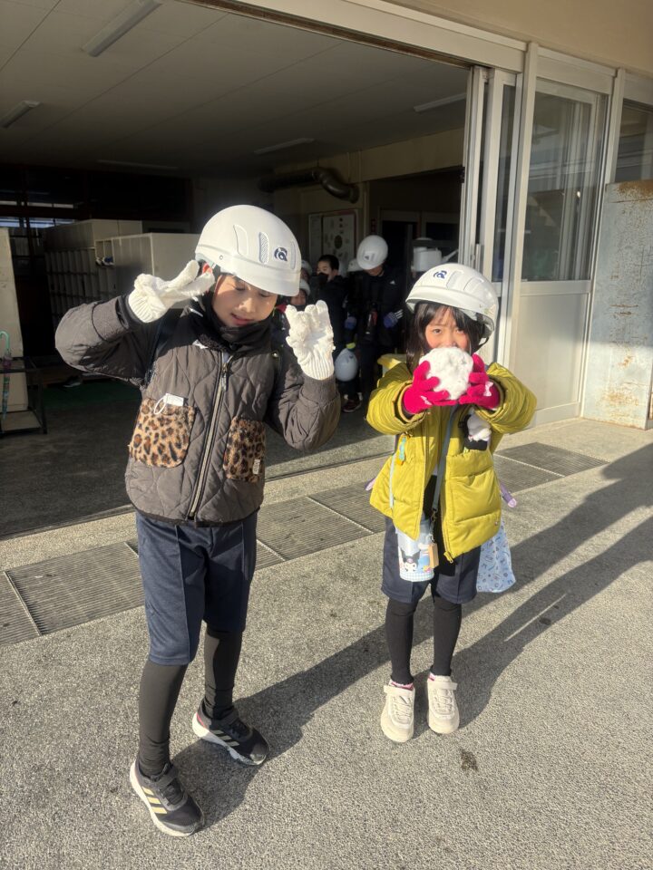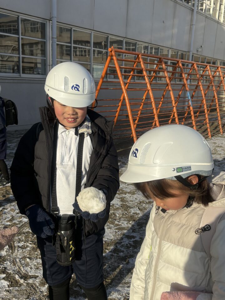 運動場では、積もった雪を集めたり、家から持ってきた雪を見せ合ったり、朝から寒さも吹き飛ばしていました。