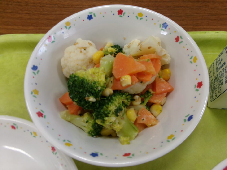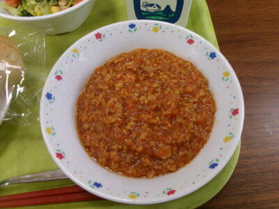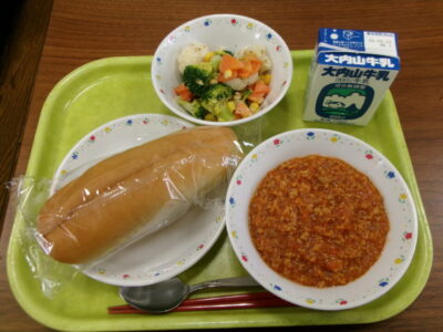 今日きょう給食きゅうしょくは、コッペパン(横切よこぎり)、ソイミートソース、牛乳ぎゅうにゅう花野菜はなやさいのごまドレサラダでした。