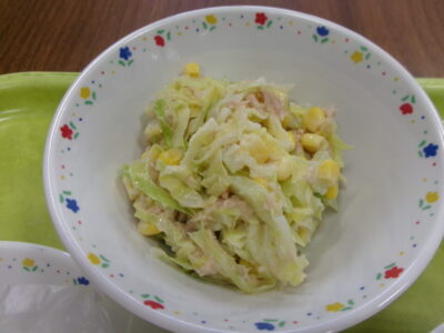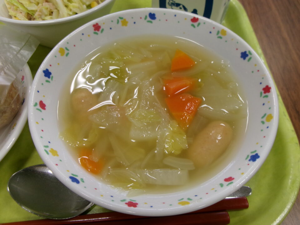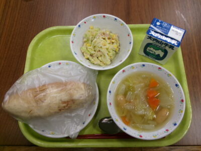 今日の給食は、揚げパン、牛乳、白菜とウインナーのスープ煮、ツナとキャベツのサラダでした。