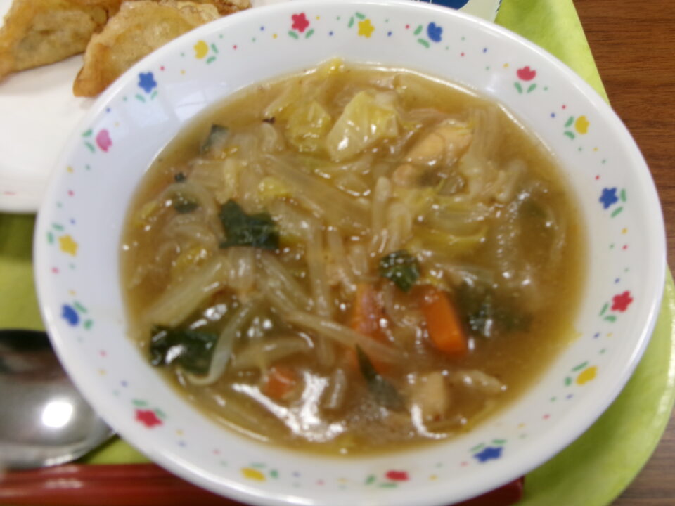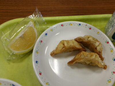 今日の給食は、ご飯(麦入り)、とり肉と野菜の中華あん、牛乳、揚げぎょうざ、はるかでした。