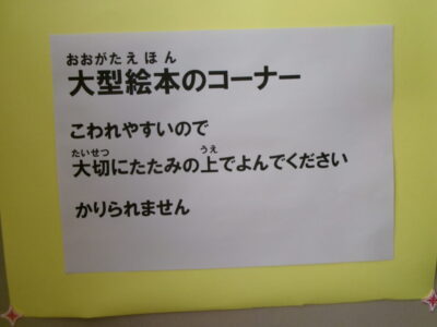 ホーム > 学校活動の様子 大型絵本(おおがたえほん)で楽(たの)しんでね💗 学校運営協議会(がっこううんえいきょうぎかい)では、大型絵本(おおがたえほん)を読書室(どくしょしつ)において、子(こ)どもたちが本(ほん)に親(した)しむ機会(きかい)を増(ふ)やせるように考(かんが)えています。 このたび、PTAで購入費(こうにゅうひ)をやりくりしていただき、大型絵本(おおがたえほん)を10冊購入(さつこうにゅう)し、さっそく整備(せいび)してもらい読書室(どくしょしつ)に並(なら)びました。 シェアする Twitter でシェア はてなブックマークに保存 LINE でシェア Facebook でシェア Pocket に保存 Feedly で購読 関連投稿 学校活動の様子 6年生からの贈り物 学校活動の様子 地区水泳 学校活動の様子 休み時間 学校活動の様子 コアラの会 学校活動の様子 調理実習(ちょうりじっしゅう) ご飯(はん)とみそ汁(しる)づくり 5-1 学校活動の様子 田植え 前の投稿 司書(ししょ)さんの本(ほん)の読(よ)み語(がた)り📚 次の投稿 3年生(ねんせい) かけ算(ざん)のひっ算学習(さんがくしゅう)CS