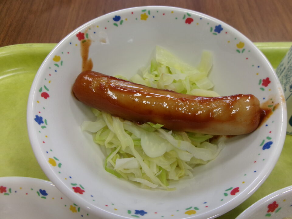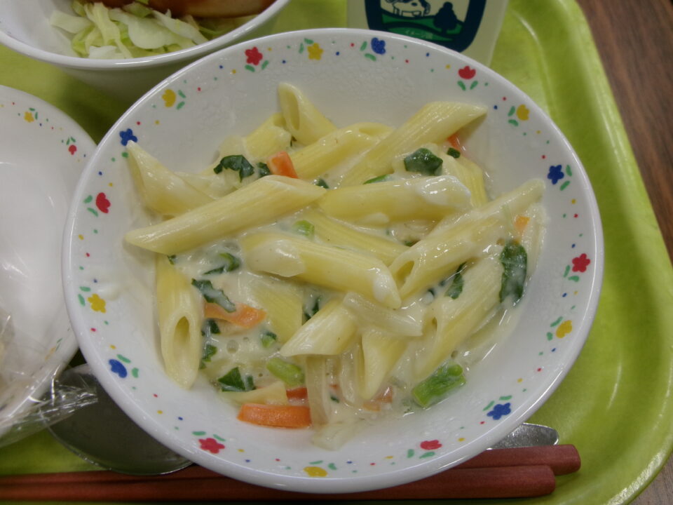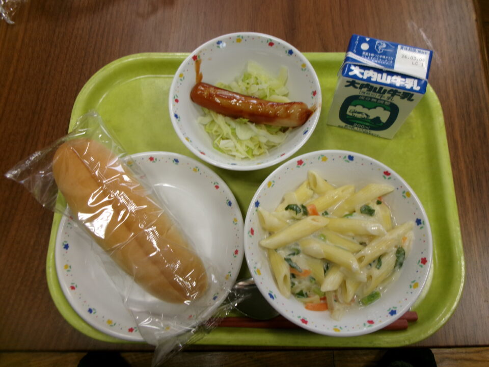 今日の給食は、小型コッペパン(縦切り)、ポークウインナー、キャベツ、牛乳、なばなのクリームペンネでした。