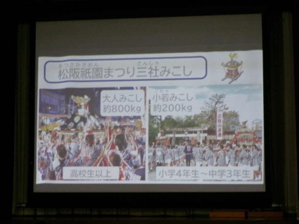 まず、なぜみこしをかついで練り歩きが始まったのか、歴史を教えていただいたり、かけ声のかけ方を練習したりしました。