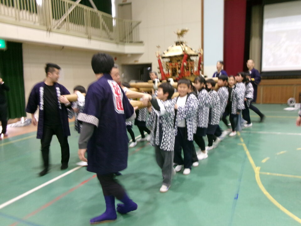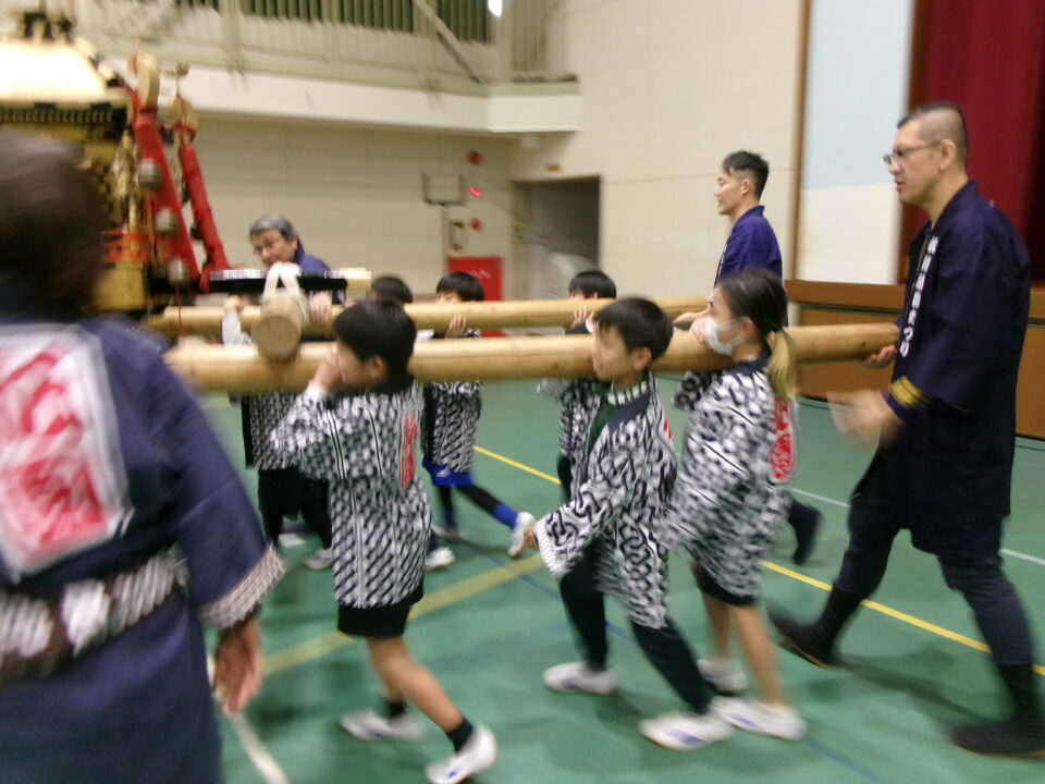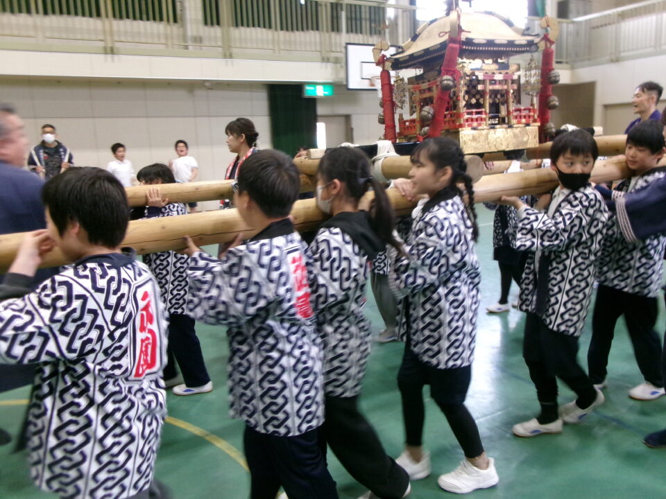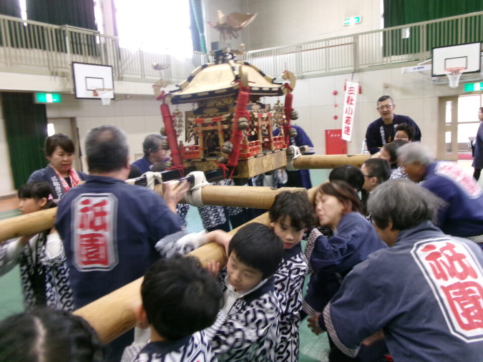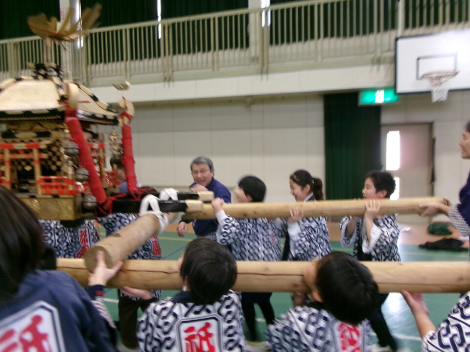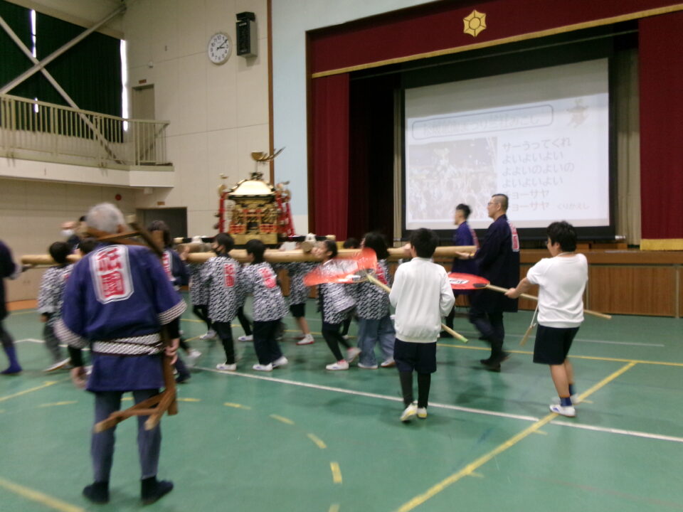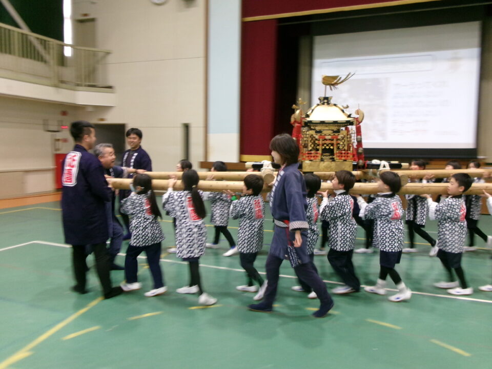 三社みこし世話人会の皆さんが、小学4年生~中学生までがかつげる小若みこしを持ってきていただき、体験をさせていただきました。