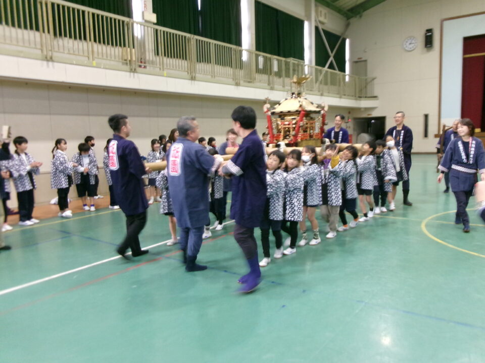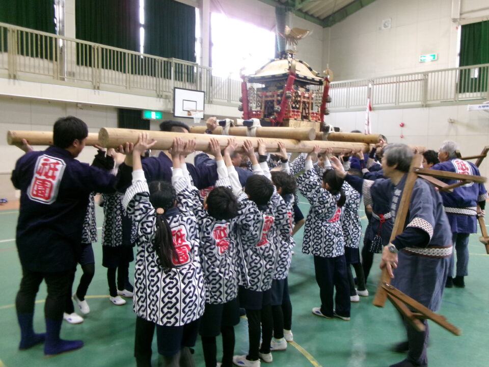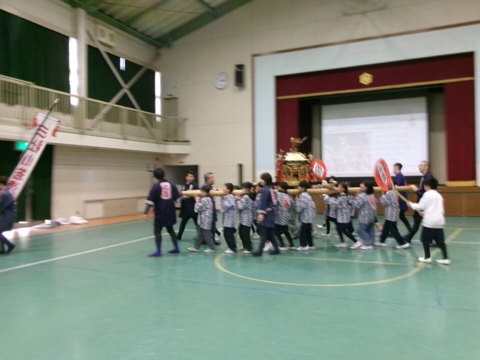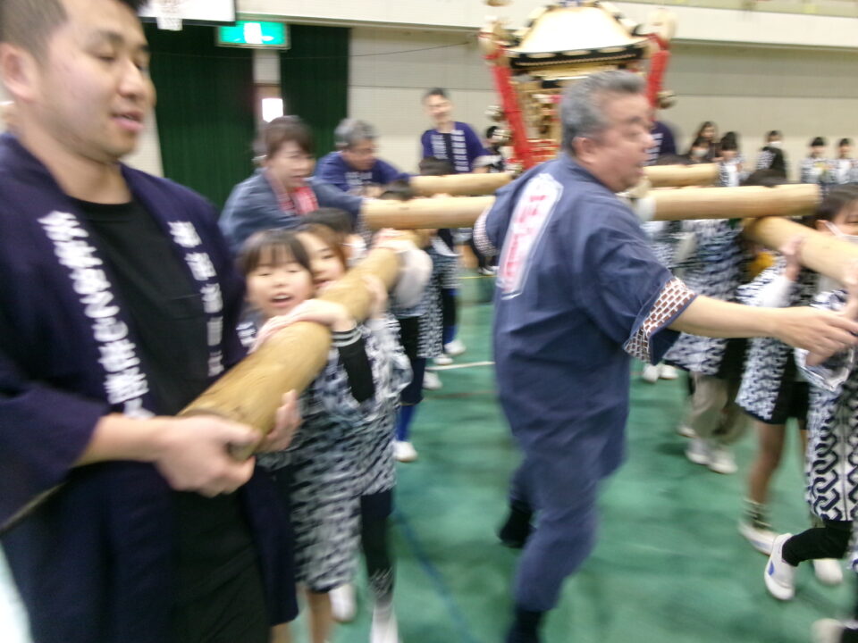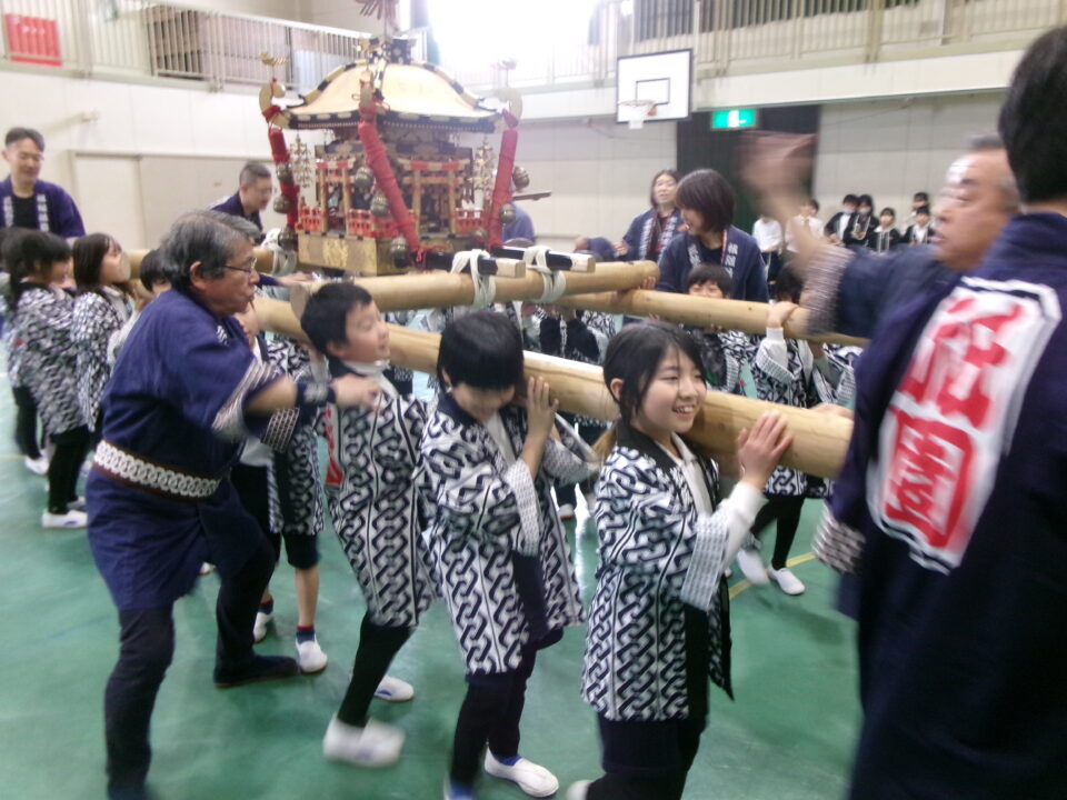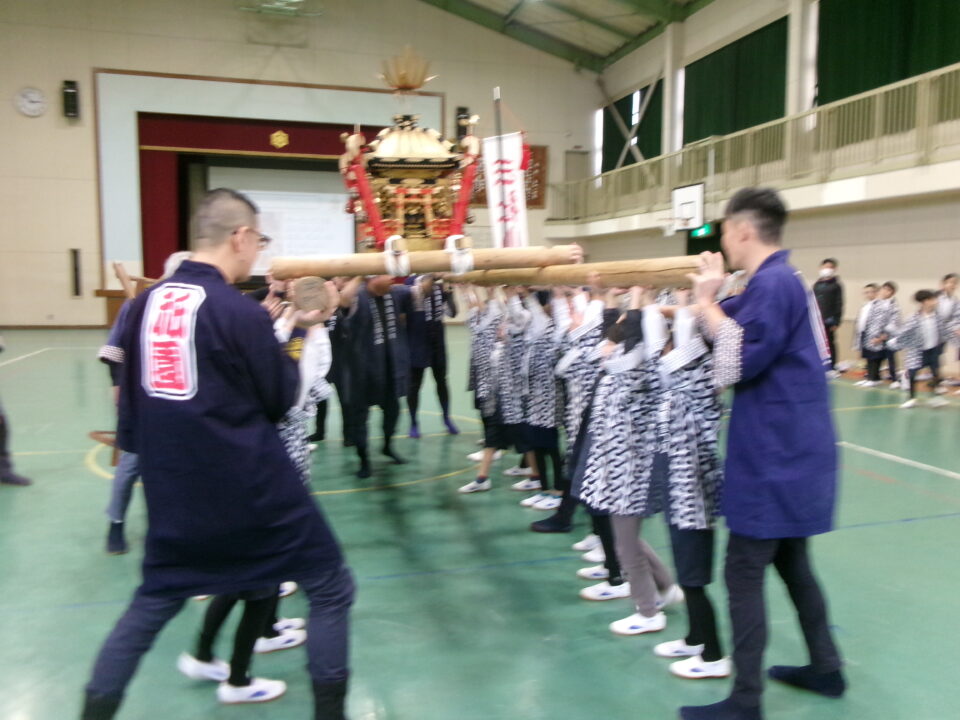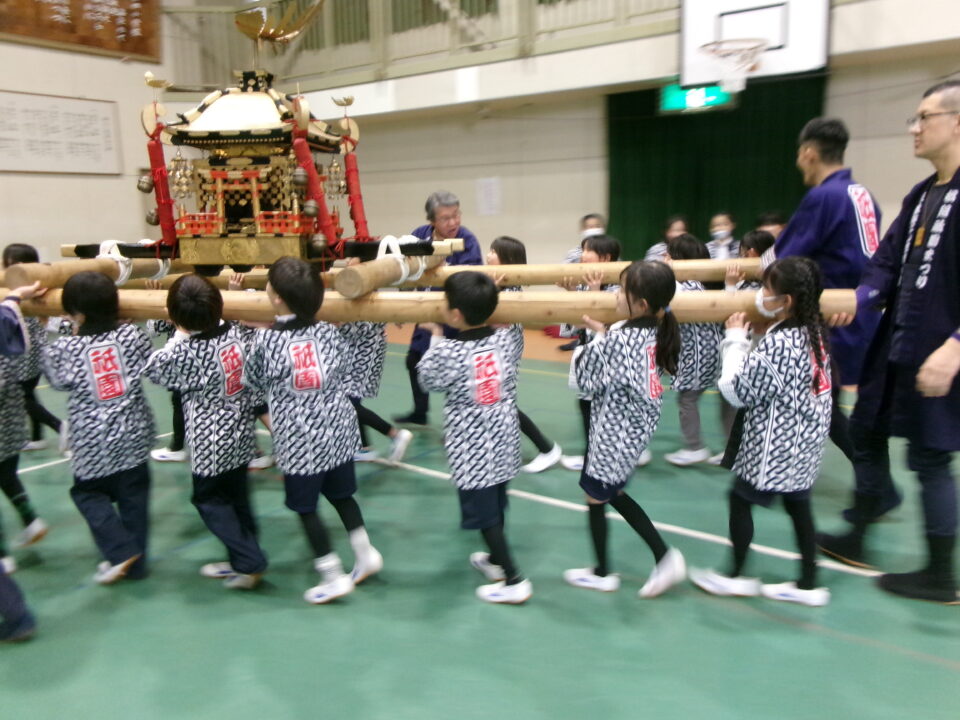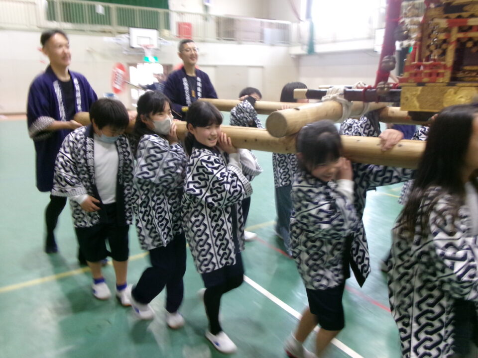 三社みこし世話人会の皆さんが、小学4年生~中学生までがかつげる小若みこしを持ってきていただき、体験をさせていただきました。