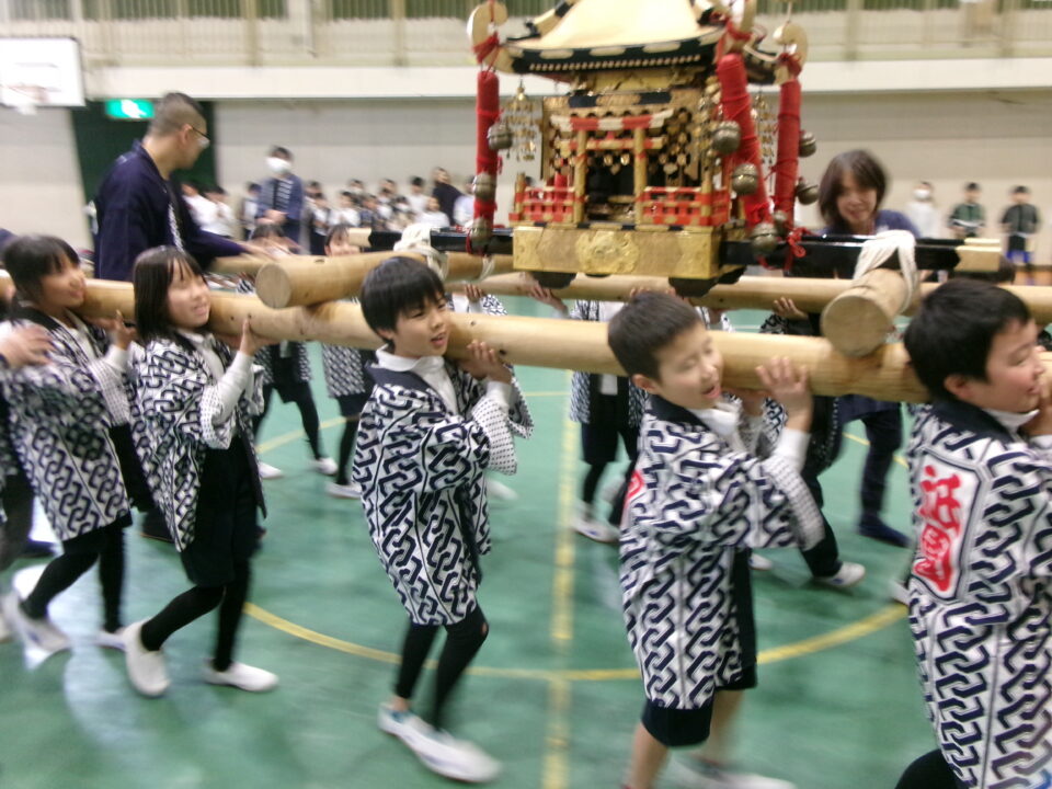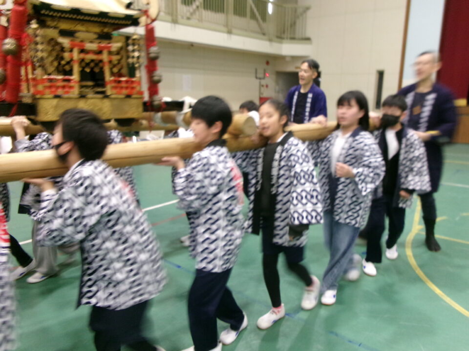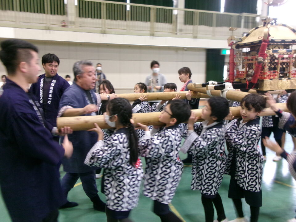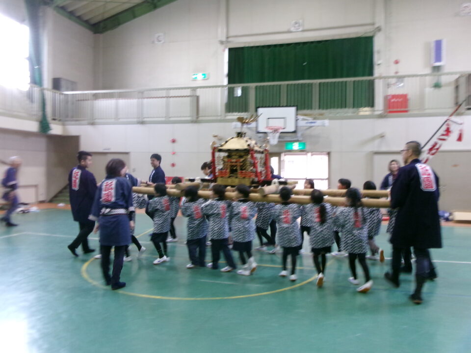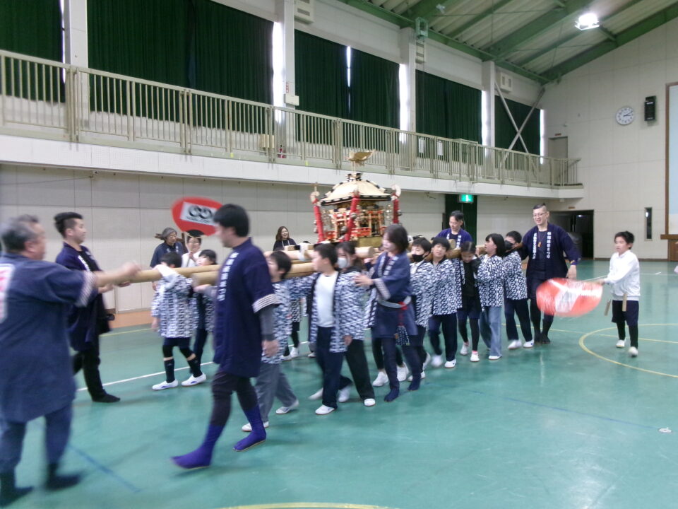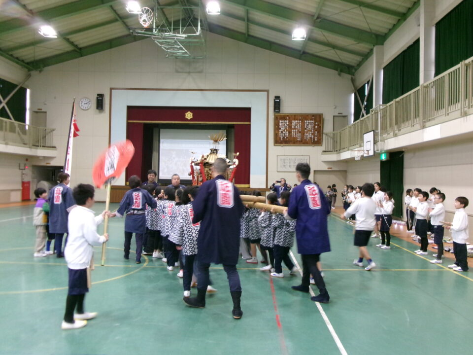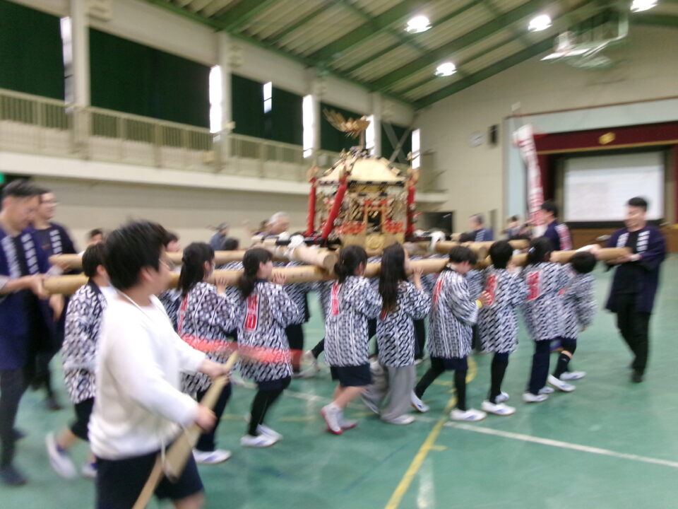 三社みこし世話人会の皆さんが、小学4年生~中学生までがかつげる小若みこしを持ってきていただき、体験をさせていただきました。