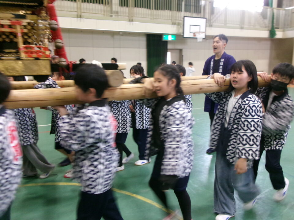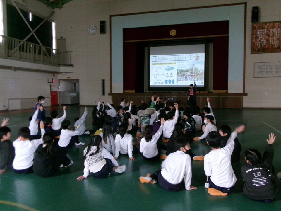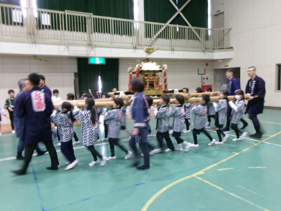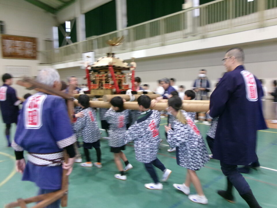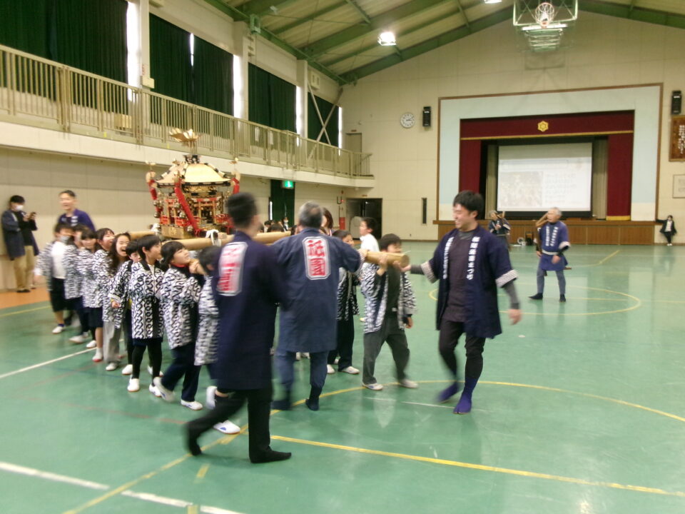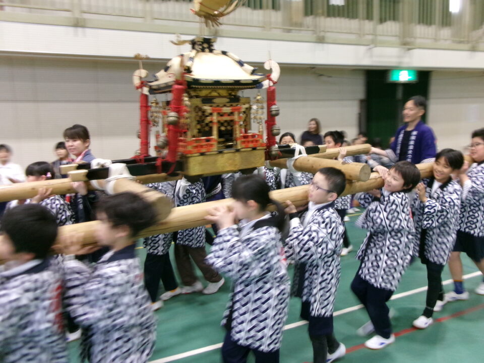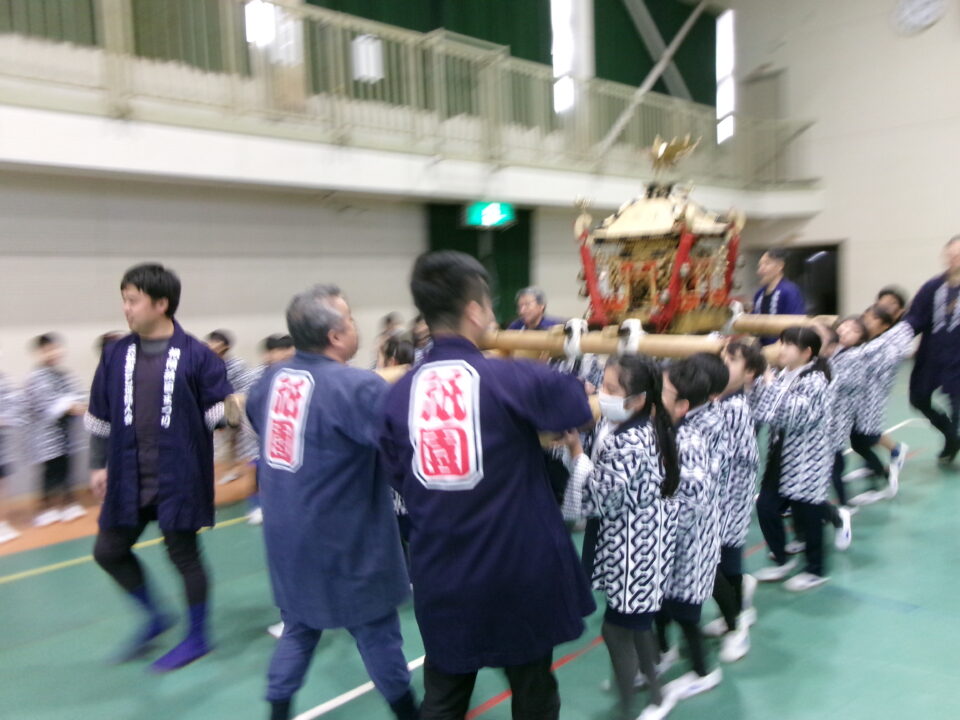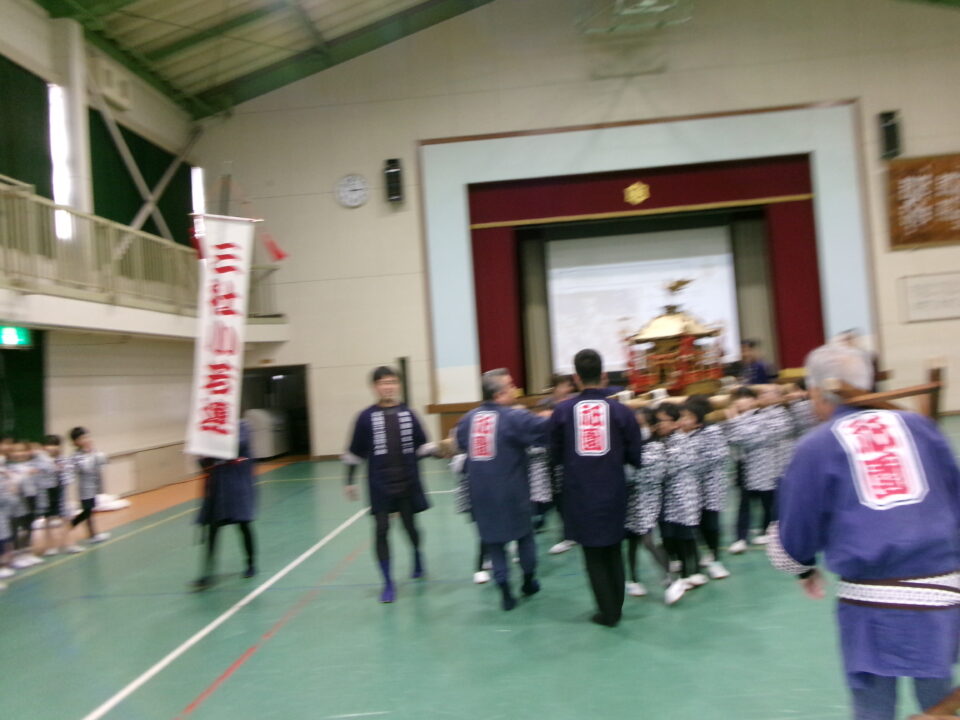 三社みこし世話人会の皆さんが、小学4年生~中学生までがかつげる小若みこしを持ってきていただき、体験をさせていただきました。