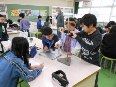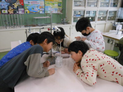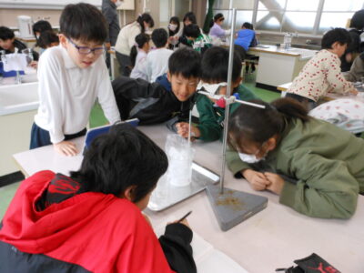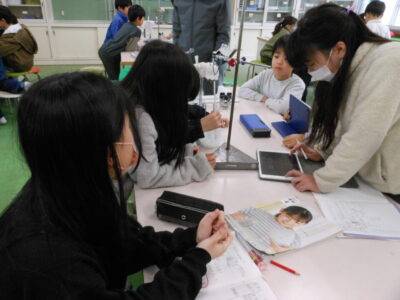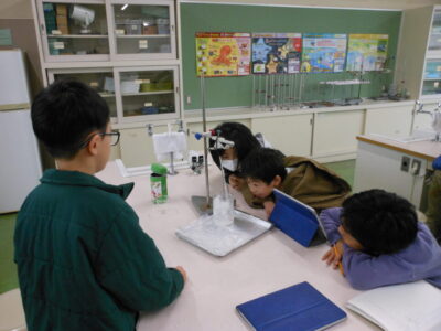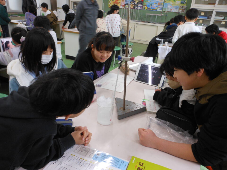 理科では、「水を冷やした時の温度の変化」の実験を行いました。水、食塩、氷、温度計等を用意し、1分ごとに温度の変化を班ごとに調べました。顔や体をくっつけ合って実験をしている姿がとても印象的でした。