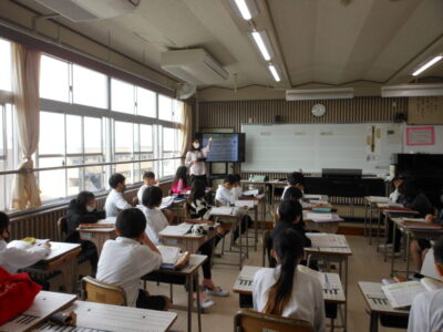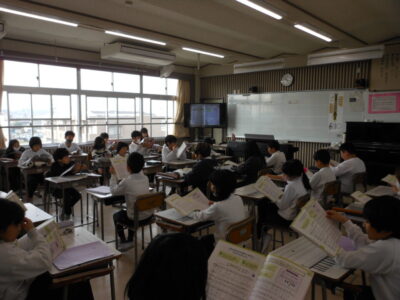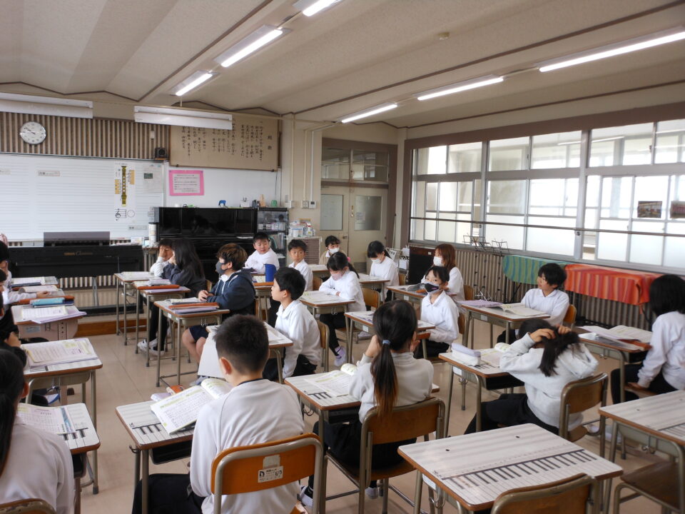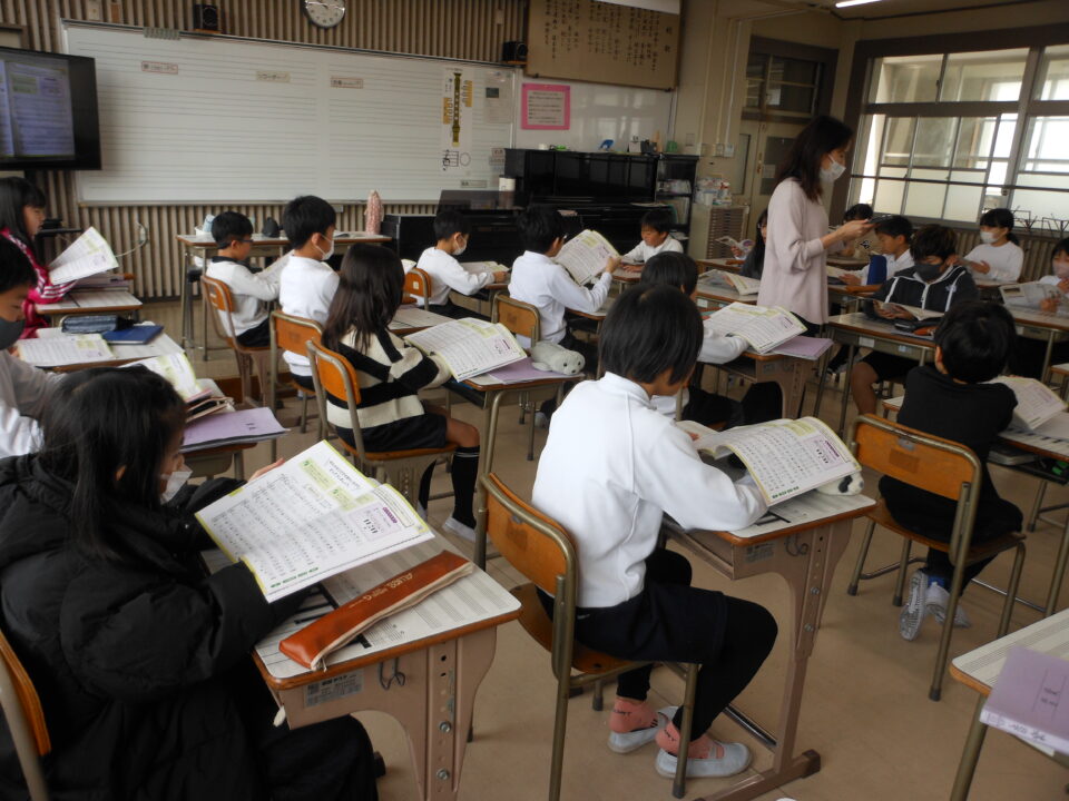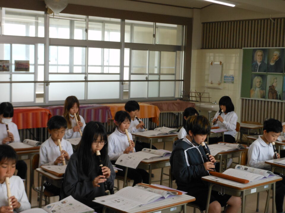 音楽では、グリーグ作曲の「朝の気分」の鑑賞をした後、「茶色の小びん」の合唱や「オーラリー」のリコーダーの練習を行いました。リコーダーでは、2つのパートに分かれて、きれいにはもることができていました。