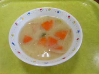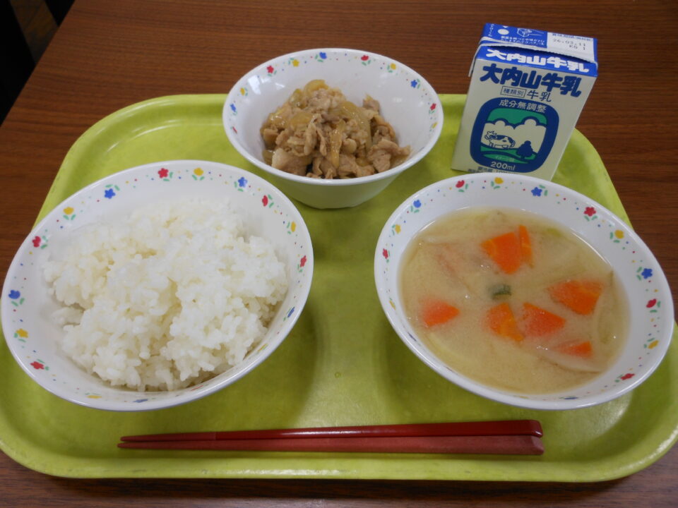 今日の給食は、ご飯、牛乳、十勝風豚丼、たけしろう汁でした。