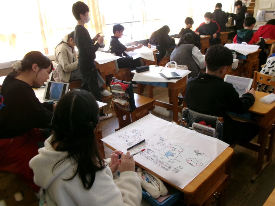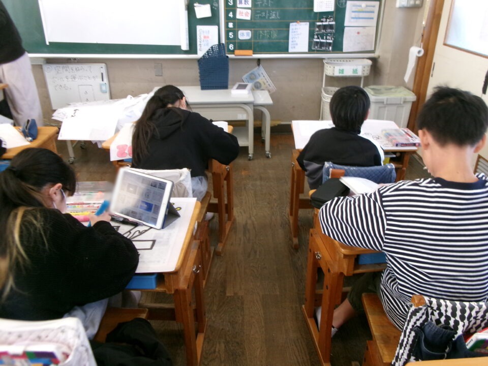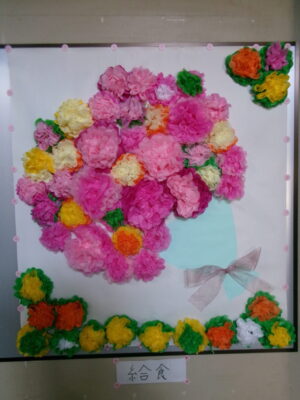 今、各掲示板には鎌中美術部制作の掲示がされています。給食室からもお祝いの掲示が飾られ、卒業をお祝いしています。