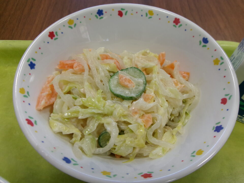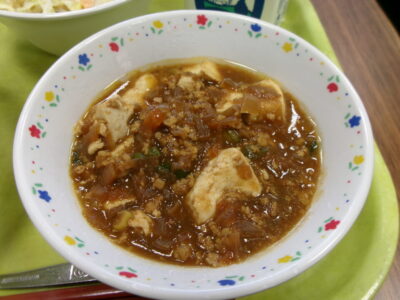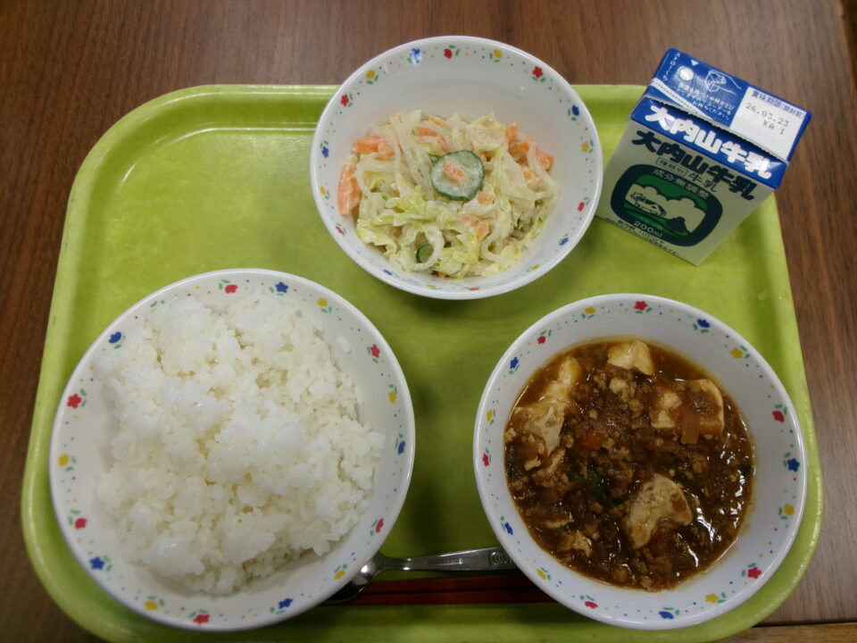 今日の給食は、ご飯、牛乳、マーボー豆腐、はるさめサラダでした。
