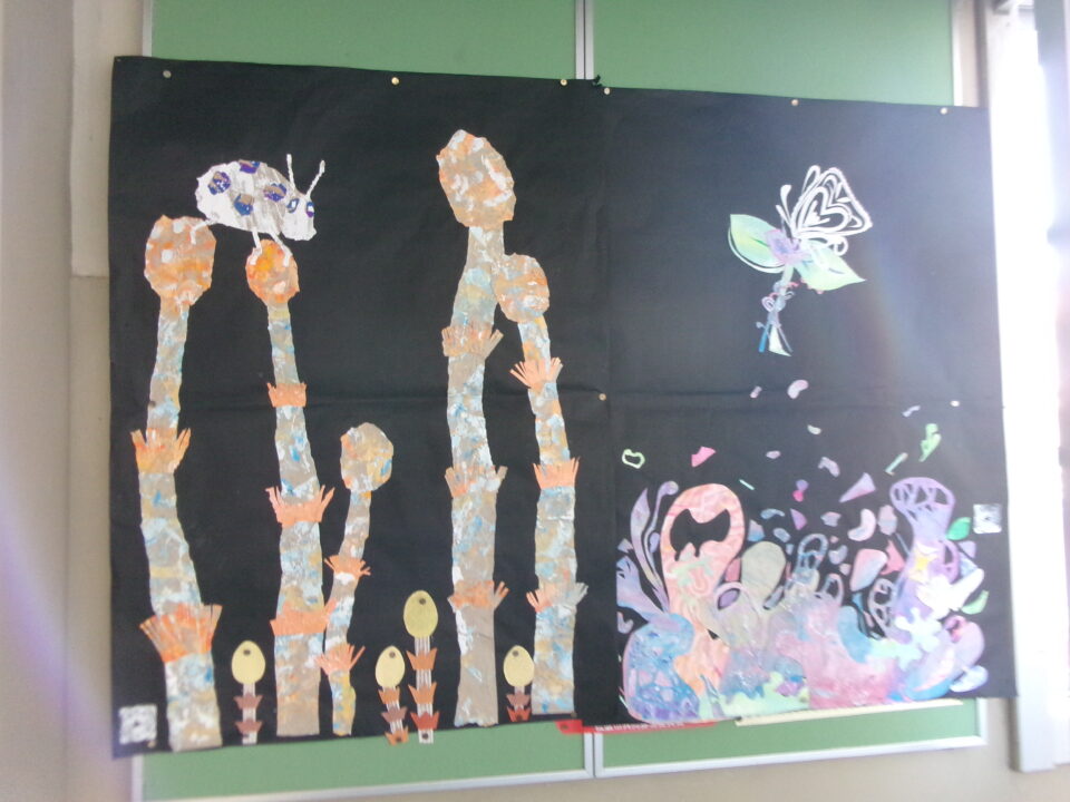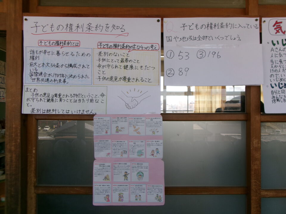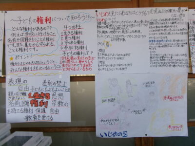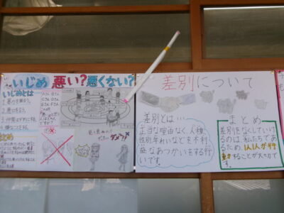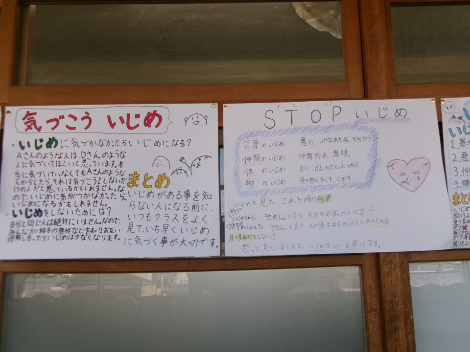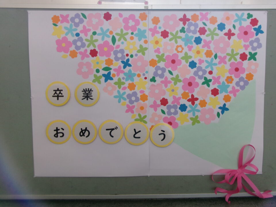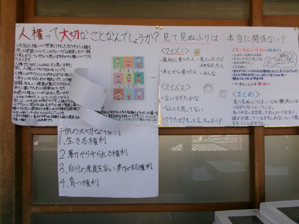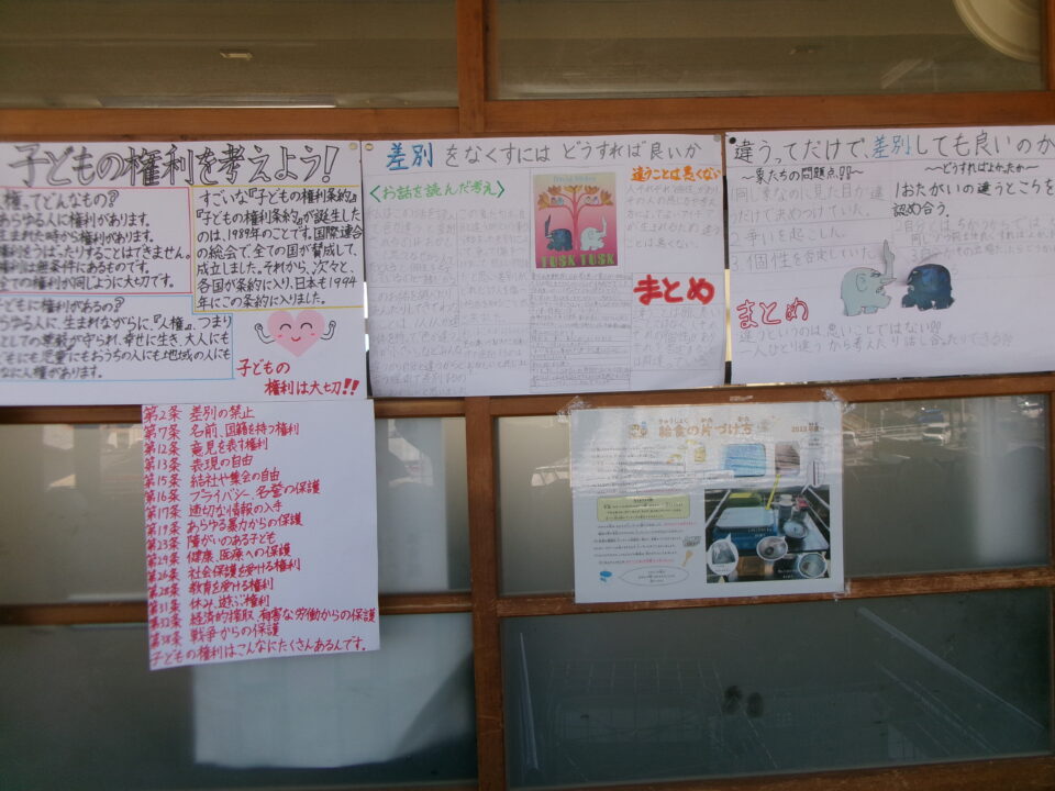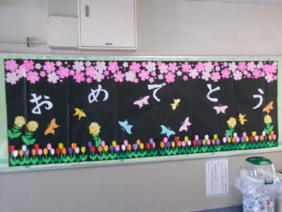 掲示板けいじばんはおいわ掲示けいじわりました。6年生教室ねんせいきょうしつでは、これまでがんばってきたあかし掲示物けいじぶつされていますね。