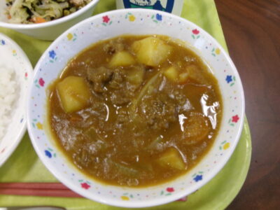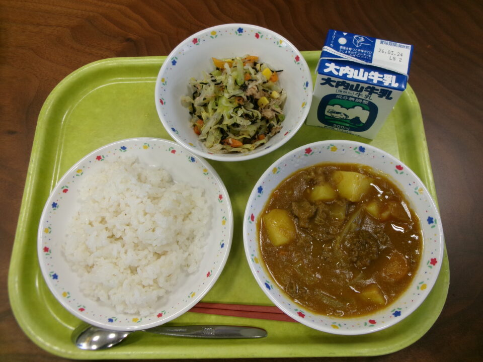 今日きょう給食きゅうしょくは、ごはん麦入むぎいり)、ビーフカレー、牛乳ぎゅうにゅう、ひじきサラダは、どの学年がくねんべるみんなのメニューです。