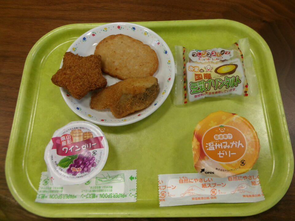 さらに6年生ねんせいは、たらのこめパンフライ、げハム、星型ほしがたコロッケのなかから1つ、ワインゼリー、みかんゼリー、おこめde国産豆乳こくさんとうにゅうプリントタルトのなかから2つえらぶことができます。