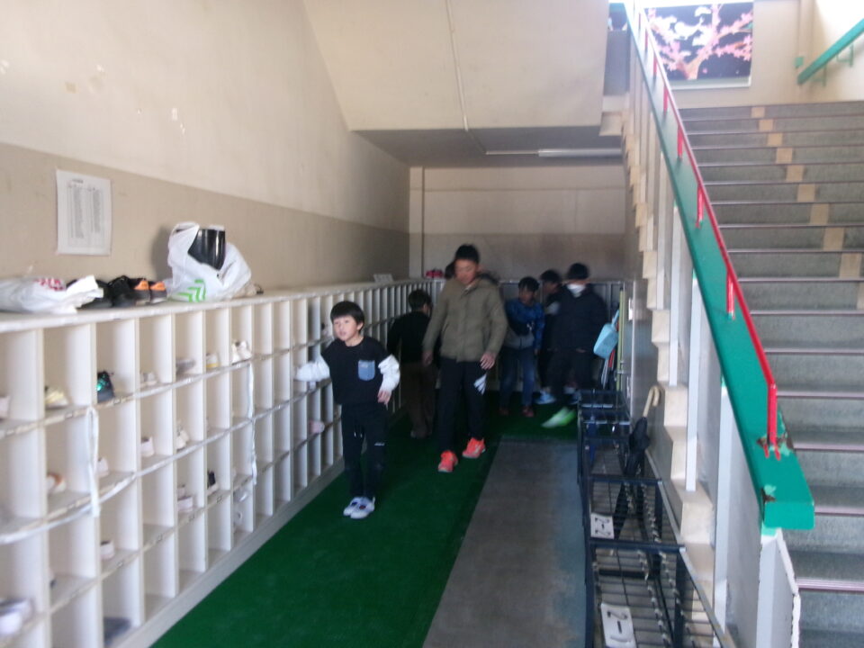 これまで、第2昇降口と第3昇降口は、出入り口から靴箱までに距離があり、そこまでは靴を脱いで上がっていました。雨の日でも靴を脱いで上がっていましたが、傘立ては中にあるので、床が濡ているところを靴下で歩いているのを見て、靴で上がれるようにマットを購入しました。