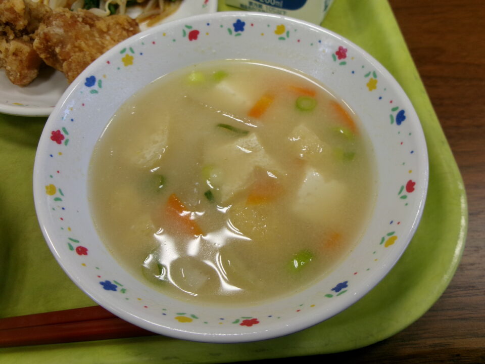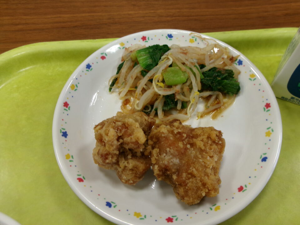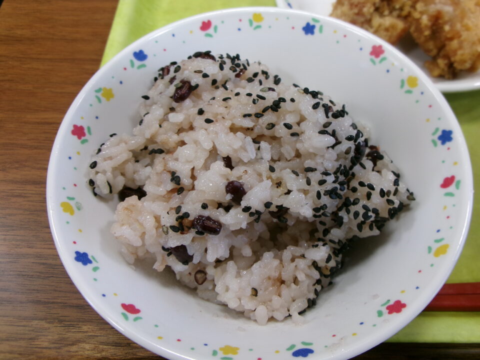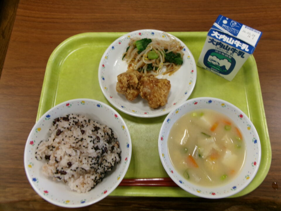 今日の給食は、赤飯、牛乳、とり肉のから揚げ、チンゲンサイのおかか和え、大根の白みそ汁でした。