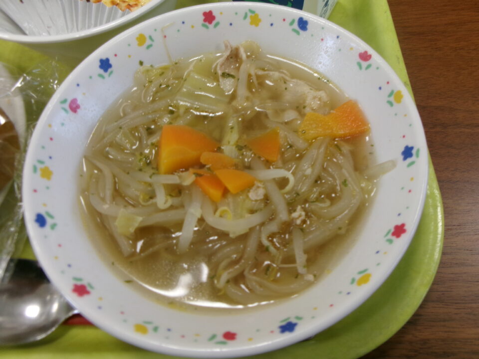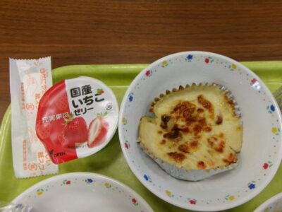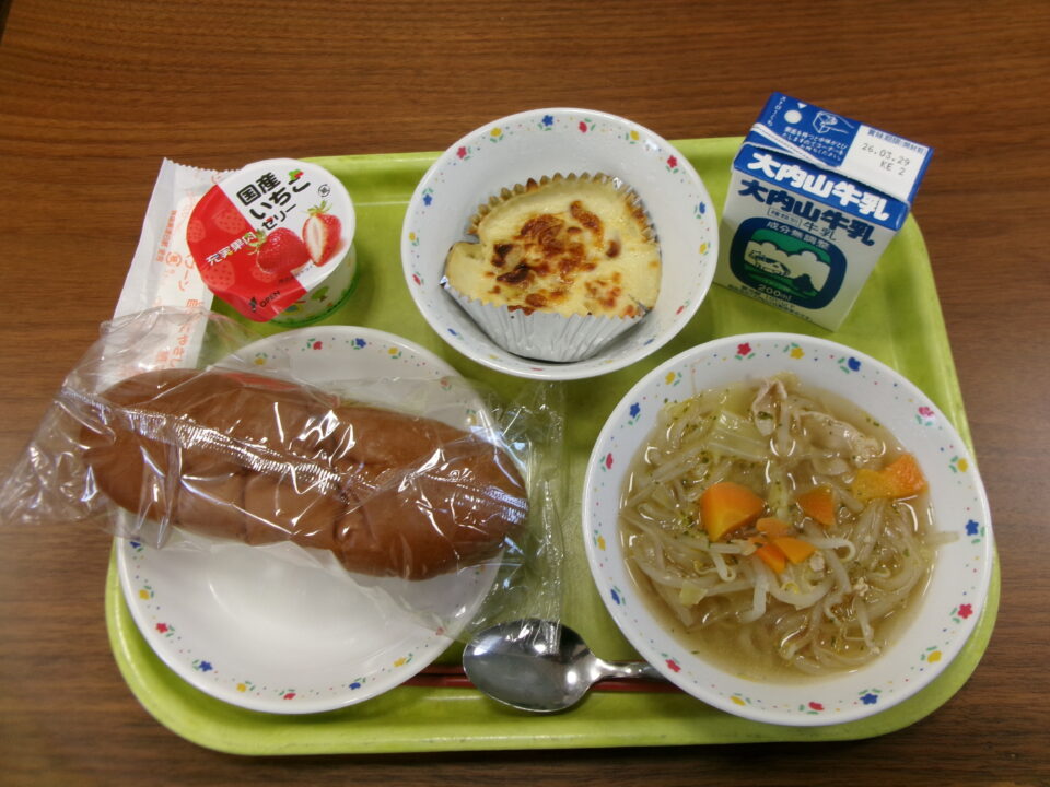 今日のメニューは、黒糖パン、牛乳、ポテトグラタン、もやしとキャベツのスープ、いちごゼリーでした。