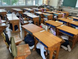 「避難訓練を行います。地震が発生しました。」のアナウンスが流れると、子どもたちは事前の指導通り素早く机の下に潜り込みます。頭をしっかり守り、机の脚をぎゅっと握りしめる姿からは、真剣に訓練に臨む緊張感が伝わってきました。