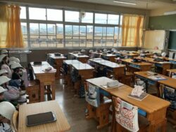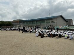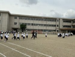 揺れがおさまったという合図で、次は運動場への一次避難です。ヘルメットをかぶり、「お・は・し・も(おさない・はしらない・しゃべらない・もどらない)」のを守りながら、落ち着いて行動することができました。