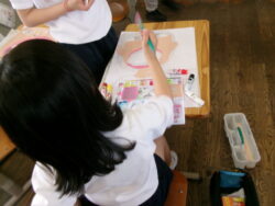 今日はめあてのようにていねいに色ぬりをがんばっていました。何色にするか、この色を混ぜてみようか、水をどれくらいつけようか・・など一人ひとり自分のこだわりをもって色ぬりをしていました。