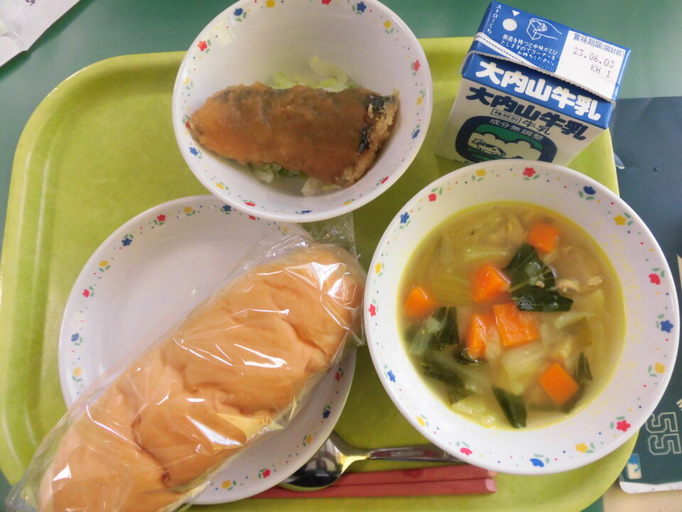 メニューは、米粉入りパン、牛乳、鰆のバーベキューソース、添えキャベツ、カレーポトフでした。