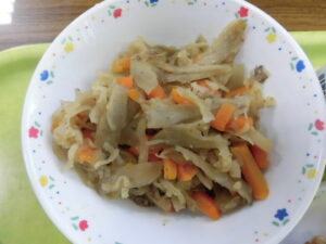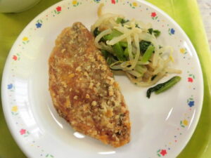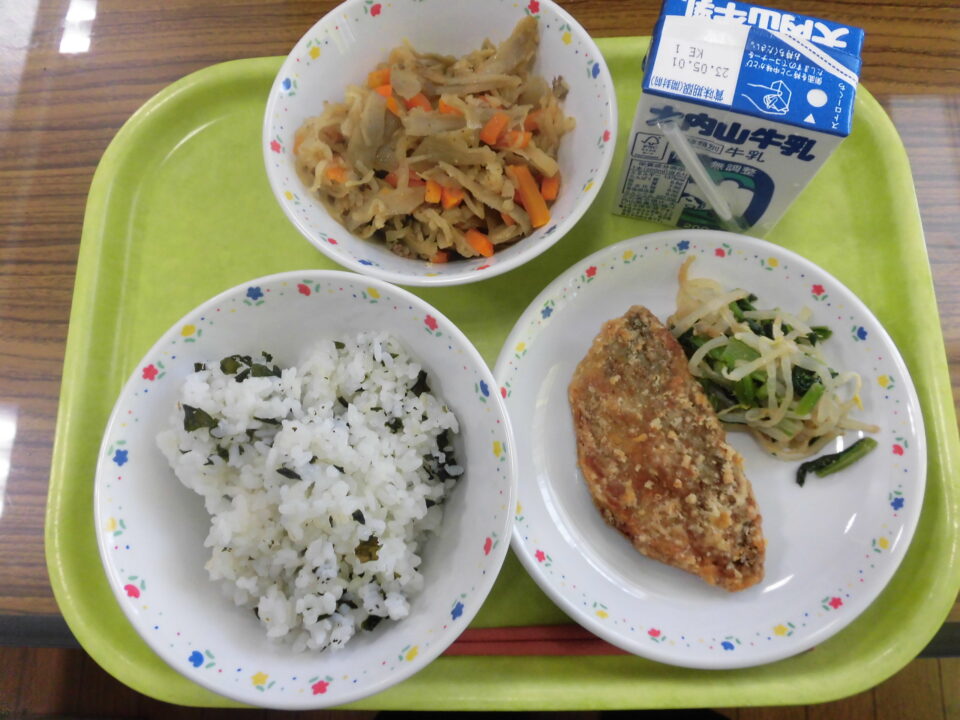今日の給食は、わかめご飯(麦入り)、牛乳、あじのから揚げ、小松菜入りごま和え、ごぼうと切り干し大根の含め煮でした。