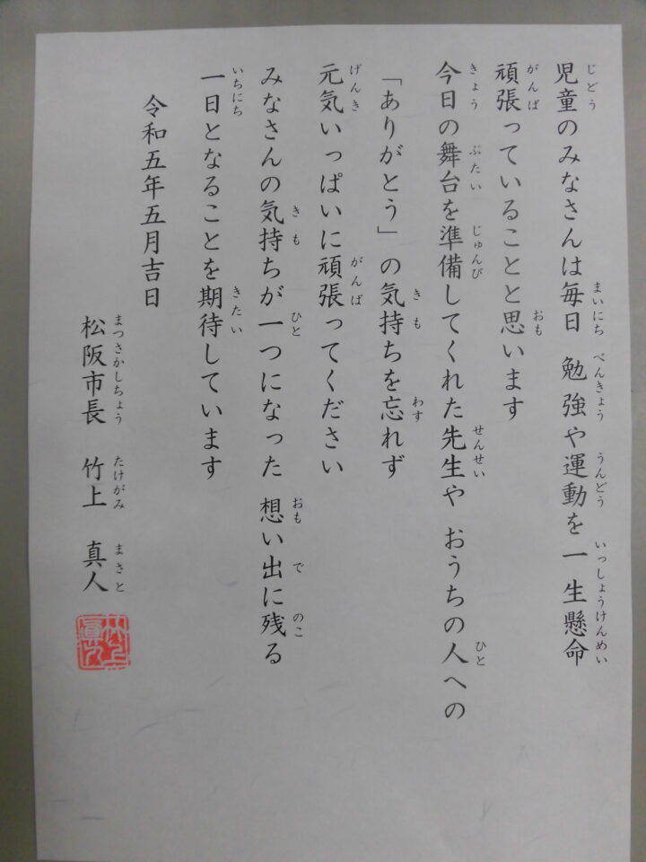 運動会当日に向けて、竹上市長からみなさんにメッセージが届きました。
