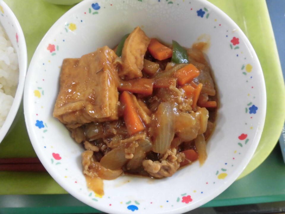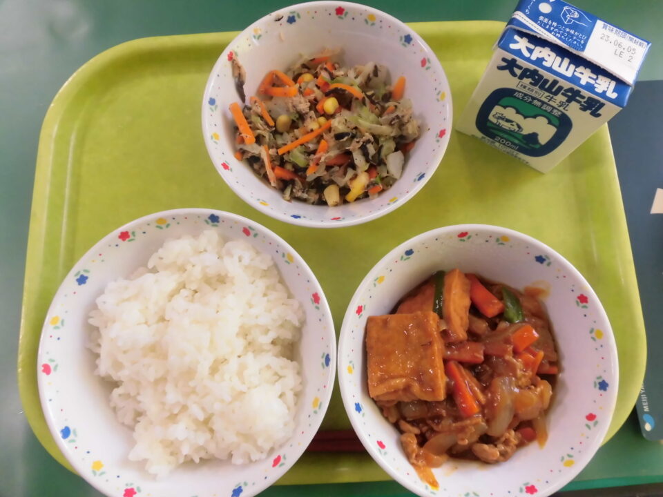 今日の給食は、ご飯、牛乳、厚揚げと豚肉のみそ炒め、ひじきサラダでした。
